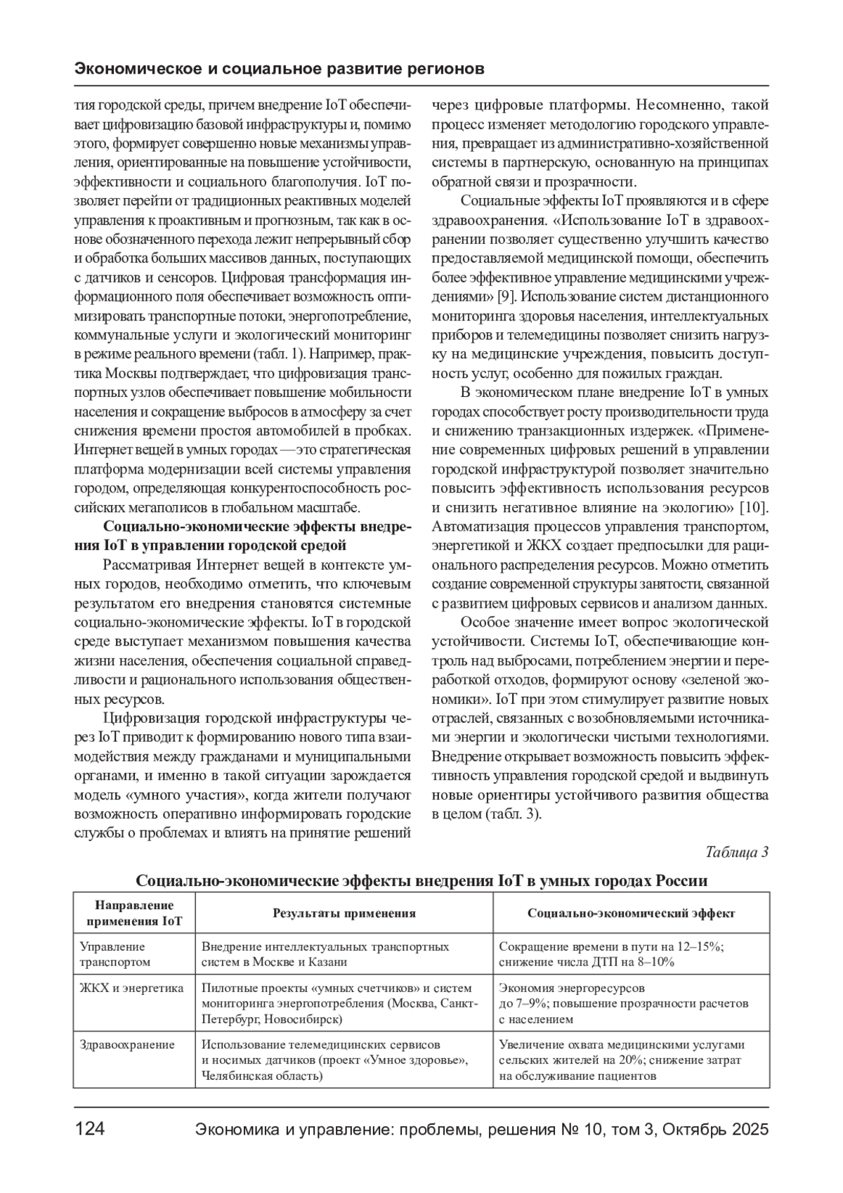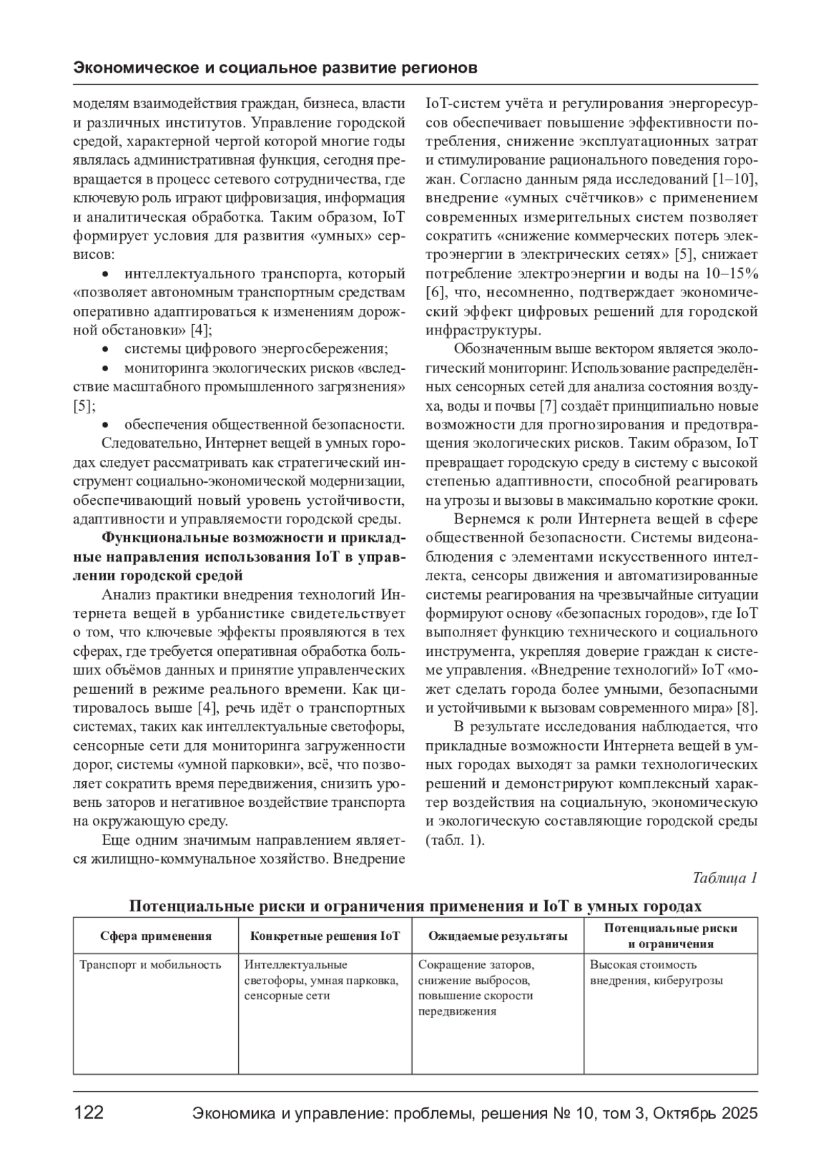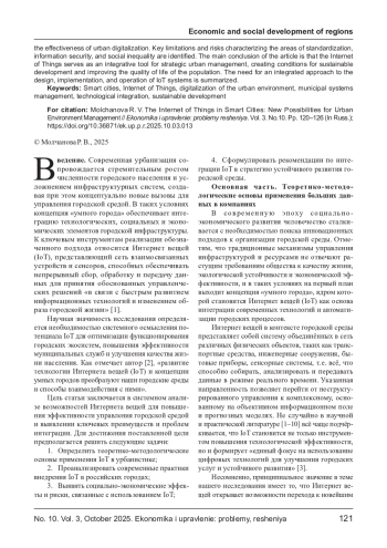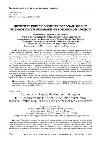 В статье рассматриваются теоретико-методологические и практические аспекты внедрения технологий Интернета вещей (IoT) в контексте формирования умных городов. Проанализированы новые возможности управления городской средой, возникающие благодаря интеграции IoT в инфраструктуру муниципальных систем, транспорт, энергетику, коммунальные службы и экологический мониторинг. Особое внимание уделено системному подходу к организации IoT-инфраструктуры, анализу технологических, организационных и социально-экономических факторов, влияющих на эффективность цифровизации городской среды. Выявлены ключевые ограничения и риски, характеризующие сферы стандартизации, информационной безопасности и социального разрыва. Основной вывод статьи заключается в том, что Интернет вещей выступает интеграционным инструментом стратегического управления городом, создавая условия для устойчивого развития и повышения качества жизни населения. Автором резюмируется необходимость комплексного подхода к проектированию, внедрению и эксплуатации IoT-систем.