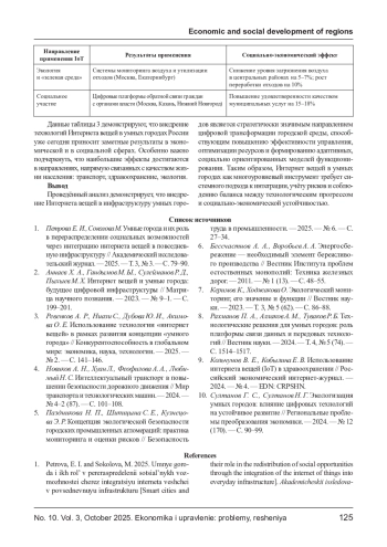 1. Петрова Е. И., Соколова М. Умные города и их роль в перераспределении социальных возможностей через интеграцию интернета вещей в повседневную инфраструктуру // Академический исследовательский журнал. - 2025. - Т. 3, № 3. - С. 79-90. EDN: KZZBVF