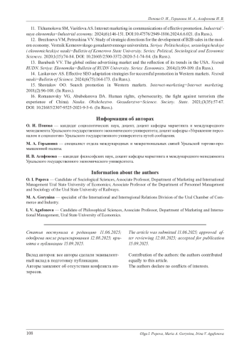 10. Попова О. И., Сысоева Т. Л., Белоусова А. А. Цифровые коммуникации как инструмент продвижения организации на рынке В2В // Вестник Академии знаний. 2023. № 5 (58). С. 257-261. EDN: BHNGSU