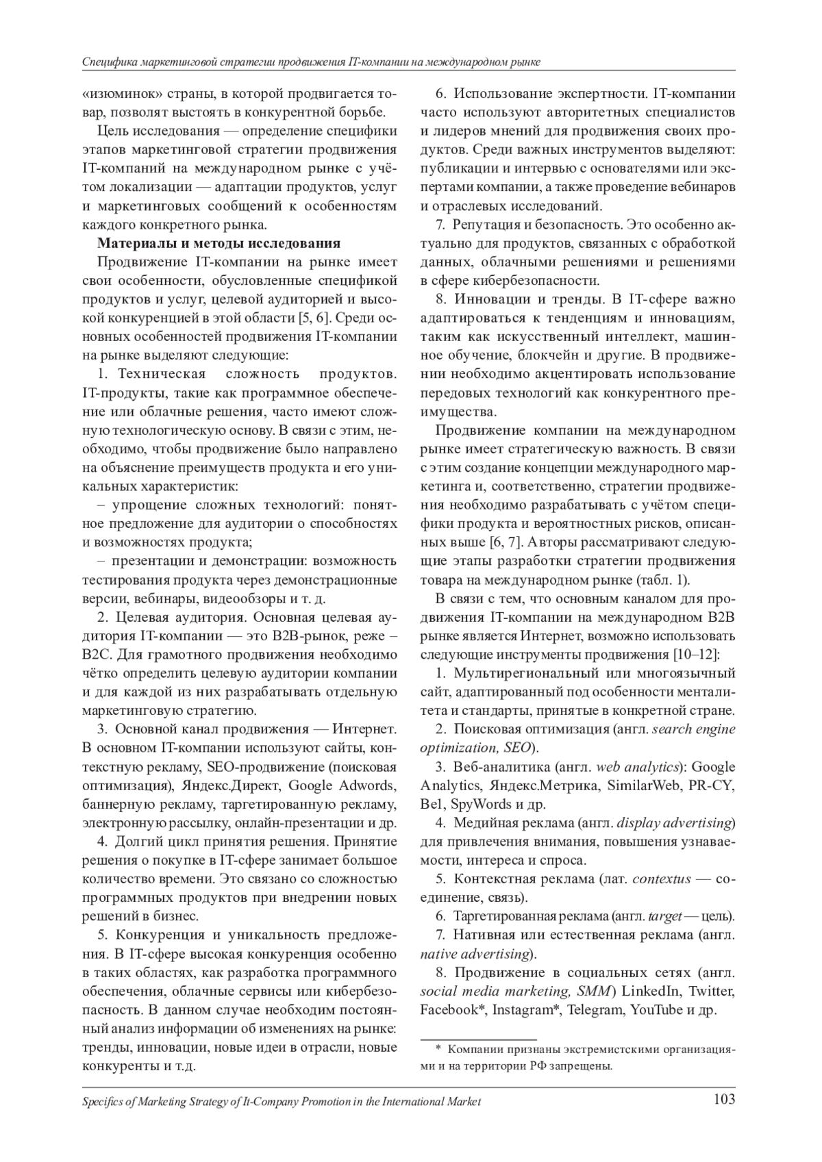 В статье рассматривается специфика этапов продвижения IT-компаний на международном рынке. Рассмотрены ограничения, влияющие не только на выход компаний на международные рынки В2В, но и определяющие условия реализации маркетинговой стратегии. Выявлены риски, которые необходимо учитывать при выводе и продвижении продукта: культурные барьеры, сопротивление инновациям, трудности коммуникации, культурные нюансы, экономические риски, изменения в политической конъюнктуре зарубежного государства. Описана специфика продуктов и услуг IT-компаний: техническая сложность продуктов, целевая аудитория, интернет-маркетинг как основной канал продвижения, длительный период для принятия решения, конкуренция и уникальность предложения, использование экспертности, репутация и безопасность, тренды и инновации. Авторы утверждают, что при разработке этапов маркетинговой стратегии продвижения IT-продуктов и услуг с учётом международной специфики важным условием является необходимость локализации и адаптации продукта и рекламных материалов под рынок определённой страны. Важно учитывать национальные особенности, экономические и политические факторы конкретной страны. Основными инструментами продвижения на международном рынке рассматриваются инструменты интернет-маркетинга. В заключении представлены особенности и инструменты продвижения IT-компании на рынках различных стран мира.