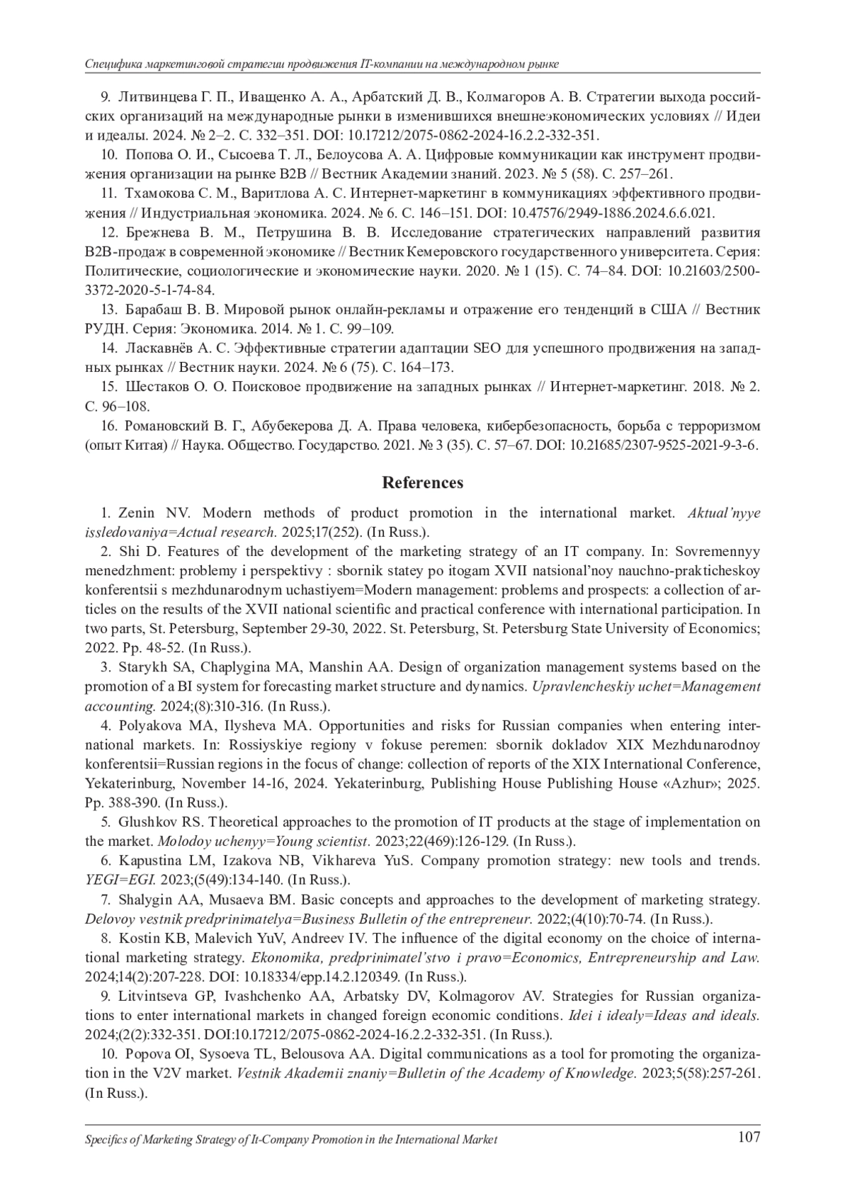 9. Литвинцева Г. П., Иващенко А. А., Арбатский Д. В., Колмагоров А. В. Стратегии выхода российских организаций на международные рынки в изменившихся внешнеэкономических условиях // Идеи и идеалы. 2024. № 2-2. С. 332-351. DOI: 10.17212/2075-0862-2024-16.2.2-332-351 EDN: FTPXAL