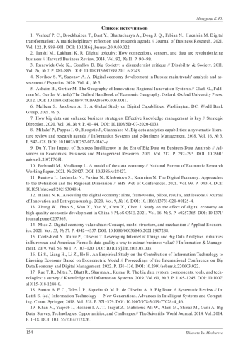 1. Verhoef P. C., Broekhuizen T., Bart Y., Bhattacharya A., Dong J. Q., Fabian N., Haenlein M. Digital transformation: A multidisciplinary reflection and research agenda // Journal of Business Research. 2021. Vol. 122. P. 889-901. DOI: 10.1016/j.jbusres.2019.09.022 EDN: BUXXSM