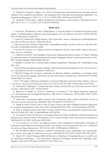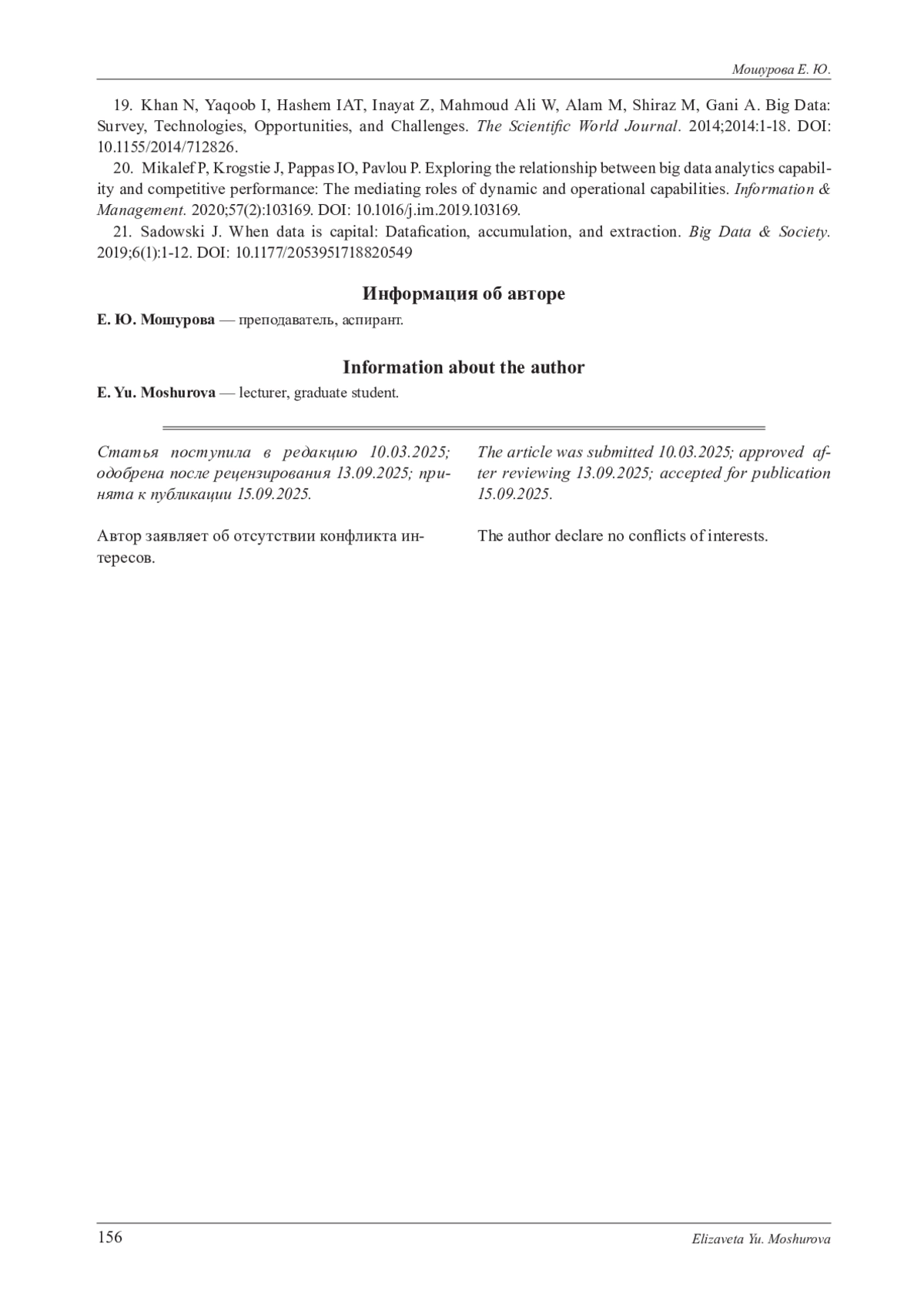 20. Mikalef P., Krogstie J., Pappas I.O., Pavlou P. Exploring the relationship between big data analytics capability and competitive performance: The mediating roles of dynamic and operational capabilities // Information & Management. 2020. Vol. 57, № 2. Р. 103169. DOI: 10.1016/j.im.2019.103169 EDN: CDAWDV