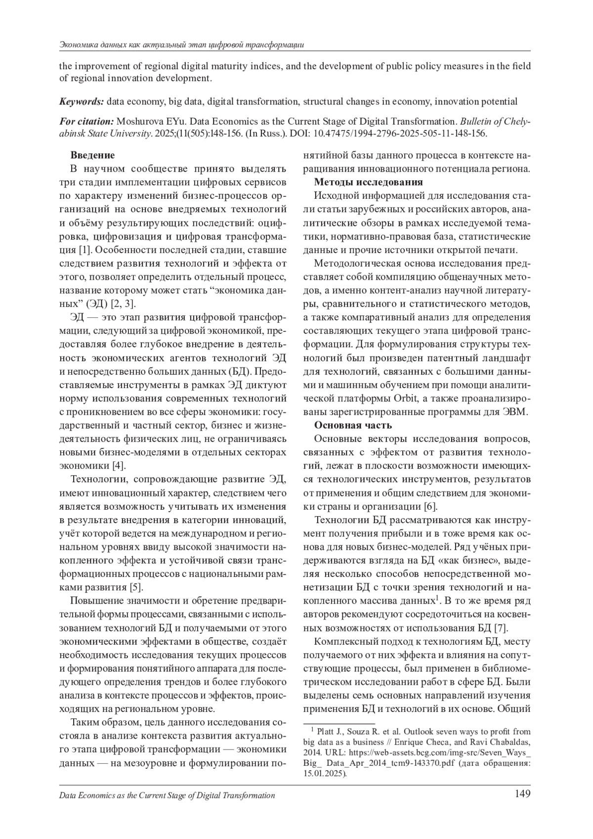 Данные становятся ключевым экономическим ресурсом, определяя характер взаимодействия экономических агентов, трансформируя рынок труда, формируя новые правила принятия решений, и корректируют принципы функционирования организаций и регионов. Цель исследования состоит в анализе контекста развития следующего этапа цифровой трансформации на мезоуровне - экономики данных, а также формулировании понятийной базы данного процесса. В результате выявлены ключевые компоненты экономики данных: человеческий капитал, массивы данных, технологии, инфраструктура; а также отражена их роль в формировании инновационного потенциала региона. На основе анализа российских и международных методик оценки инновационного потенциала выявлены их ограничения в отражении трансформационных процессов, обусловленных развитием экономики данных. Обоснована необходимость разработки отдельной методики оценки развития экономики данных на региональном уровне. Полученные выводы могут быть использованы при формировании региональных стратегий цифровой трансформации, совершенствовании индексов цифровой зрелости регионов, а также разработке мер государственной политики в сфере инновационного развития регионов.