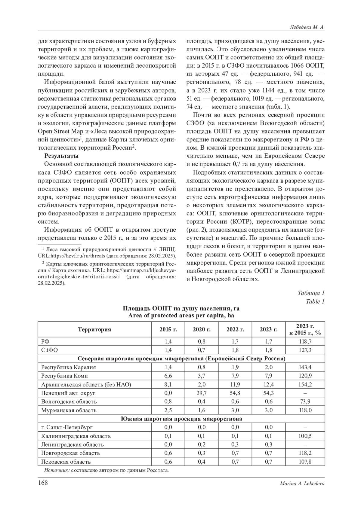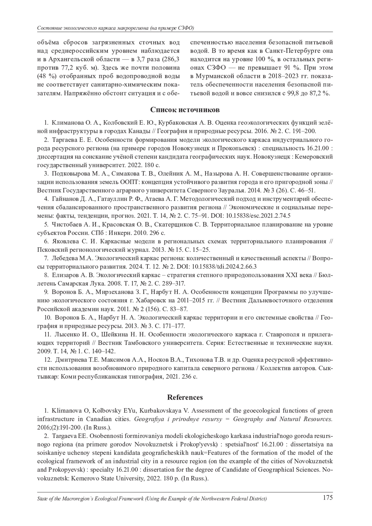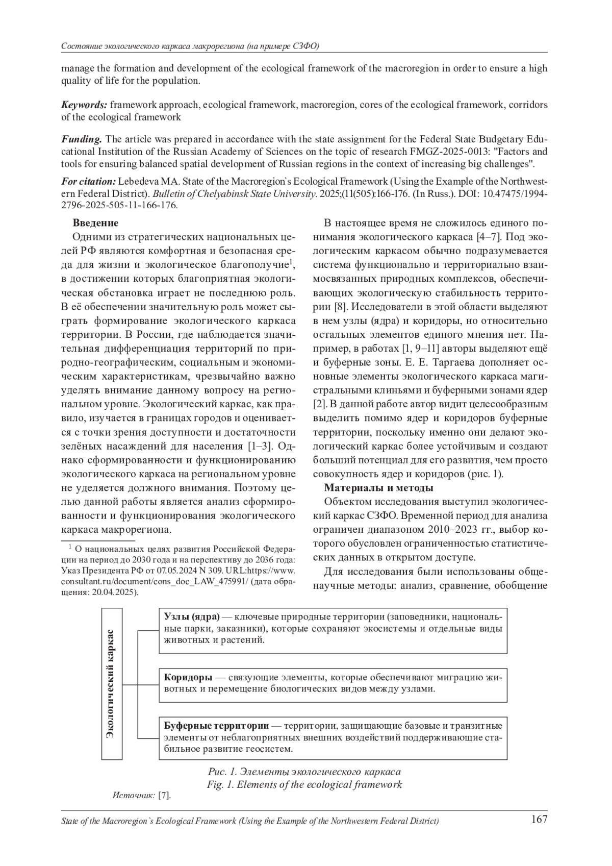 7. Лебедева М.А. Экологический каркас региона: количественный и качественный аспекты // Вопросы территориального развития. 2024. Т. 12. № 2. DOI: 10.15838/tdi.2024.2.66.3 EDN: FIGGEW