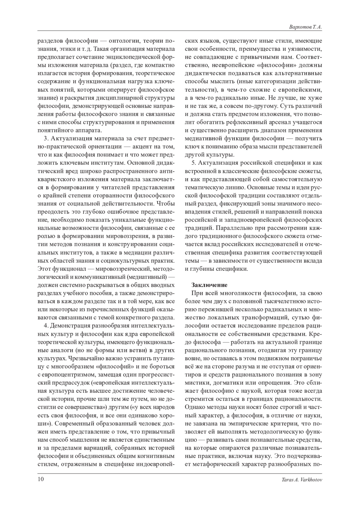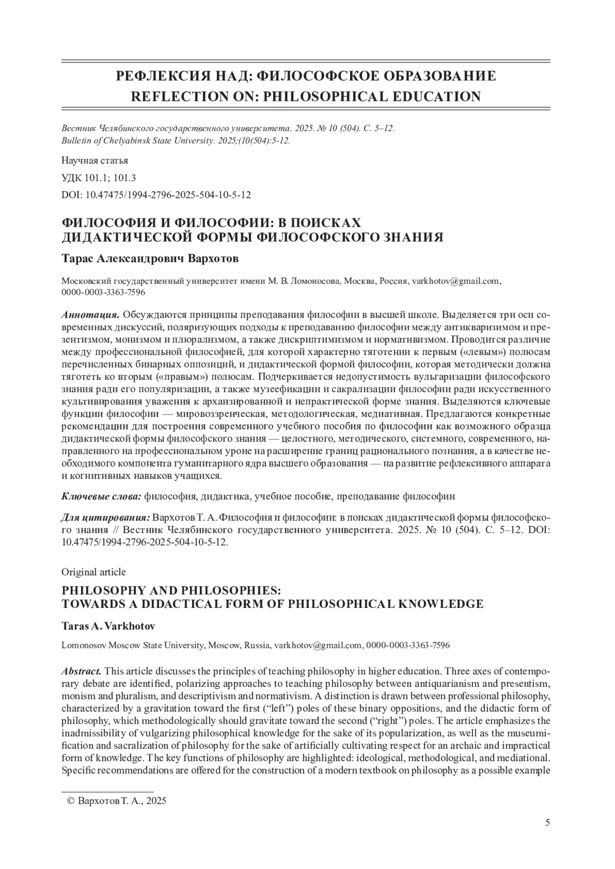 Обсуждаются принципы преподавания философии в высшей школе. Выделяется три оси современных дискуссий, поляризующих подходы к преподаванию философии между антикваризимом и презентизмом, монизмом и плюрализмом, а также дискриптимизмом и нормативизмом. Проводится различие между профессиональной философией, для которой характерно тяготении к первым («левым») полюсам перечисленных бинарных оппозиций, и дидактической формой философии, которая методически должна тяготеть ко вторым («правым») полюсам. Подчеркивается недопустимость вульгаризации философского знания ради его популяризации, а также музеефикации и сакрализации философии ради искусственного культивирования уважения к архаизированной и непрактической форме знания. Выделяются ключевые функции философии - мировоззренческая, методологическая, медиативная. Предлагаются конкретные рекомендации для построения современного учебного пособия по философии как возможного образца дидактической формы философского знания - целостного, методического, системного, современного, направленного на профессиональном уроне на расширение границ рационального познания, а в качестве необходимого компонента гуманитарного ядра высшего образования - на развитие рефлексивного аппарата и когнитивных навыков учащихся.