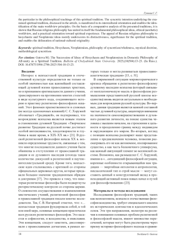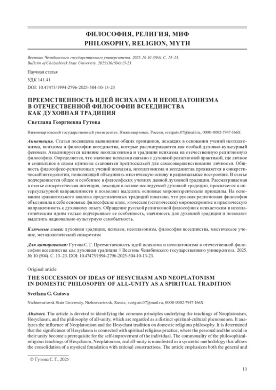 Статья посвящена выявлению общих принципов, лежащих в основании учений неоплатонизма, исихазма и философии всеединства, которые рассматриваются как особый духовно-культурный феномен. Анализируется влияние неоплатонизма и традиции исихазма на отечественную религиозную философию. Определяется, что значение исихазма связано с духовной религиозной практикой, где личное и социальное в своем единстве становятся предпосылкой для самосовершенствования личности. Общность философско-религиозных учений исихазма, неоплатонизма и всеединства проявляется в синкретической методологии, позволяющей объединить мистическую основу и рациональные построения. В статье подчеркивается общее и особенное в философских учениях данной духовной традиции. Рассматриваемая в статье синкретическая интенция, лежащая в основе исследуемой духовной традиции, проявляется в интеркультурной направленности и позволяет выделить основные мировоззренческие принципы. На основании сравнительного анализа представленных традиций показано, что русская религиозная философия объединила в себе основные философские идеи, этическое (эстетическое) мировосприятие и практическую направленность к духовному опыту. Обращение русской религиозной философии к исихастским и неоплатоническим идеям только подчеркивает ее особенность, значимость для духовной традиции и позволяет выделить национально-культурную самобытность.