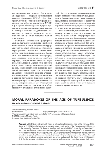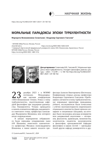 Для цитирования: Силантьева М. В., Глаголев В. С. Моральные парадоксы эпохи турбулентности. Концепт: философия, религия, культура. 2024;8(1):160-162. https://doi. org/10.24833/2541-8831-2024-1-29-160-162