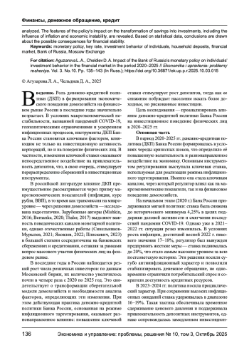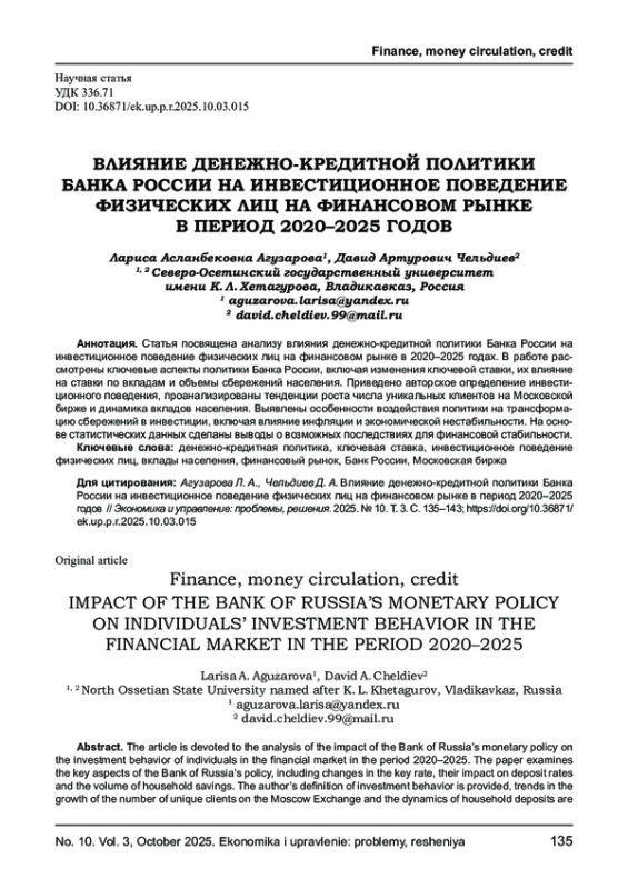 2. Агузарова Л. А., Чельдиев Д. А. Влияние политики банка России на инвестиционное поведение населения на финансовом рынке // Экономика и управление: проблемы, решения. - 2024. - Т. 11. - № 9 (150). - С. 104-110. EDN: CDDXAN