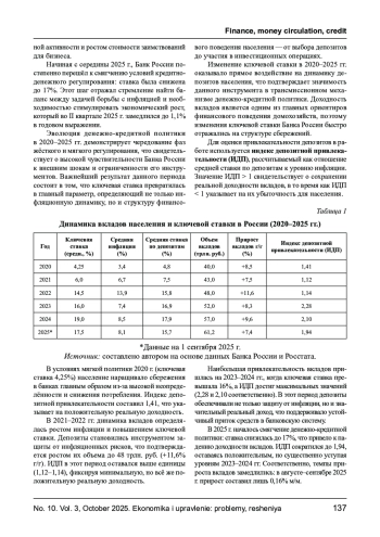 Статья посвящена анализу влияния денежно-кредитной политики Банка России на инвестиционное поведение физических лиц на финансовом рынке в 2020-2025 годах. В работе рассмотрены ключевые аспекты политики Банка России, включая изменения ключевой ставки, их влияние на ставки по вкладам и объемы сбережений населения. Приведено авторское определение инвестиционного поведения, проанализированы тенденции роста числа уникальных клиентов на Московской бирже и динамика вкладов населения. Выявлены особенности воздействия политики на трансформацию сбережений в инвестиции, включая влияние инфляции и экономической нестабильности. На основе статистических данных сделаны выводы о возможных последствиях для финансовой стабильности.