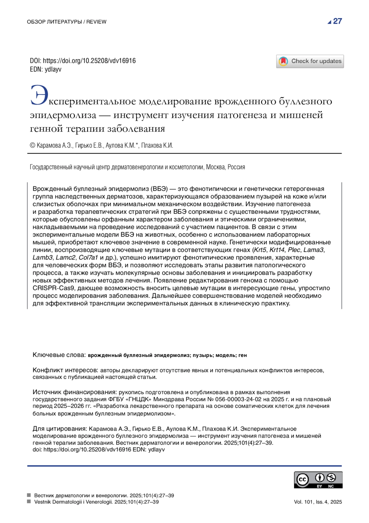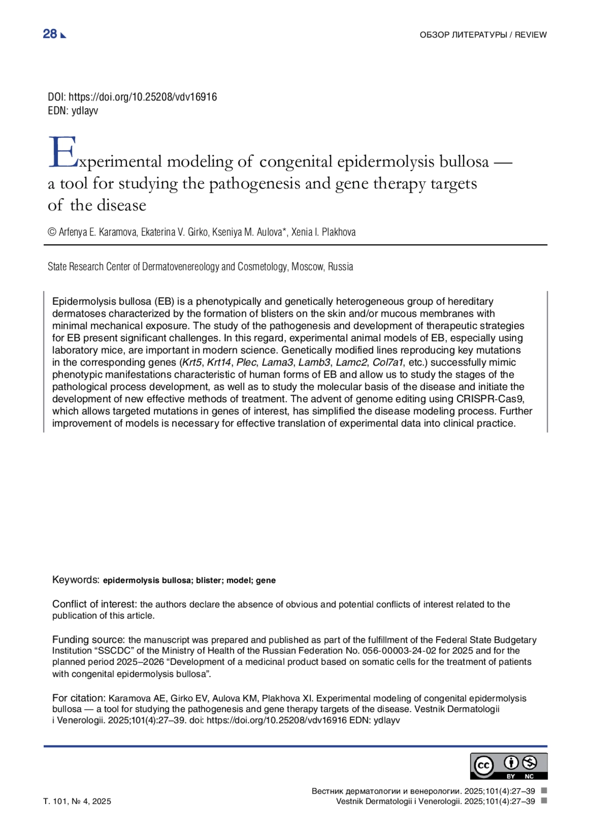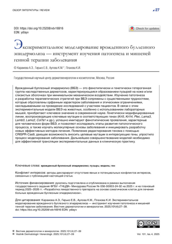 Врожденный буллезный эпидермолиз (ВБЭ) — это фенотипически и генетически гетерогенная группа наследственных дерматозов, характеризующаяся образованием пузырей на коже и/ или слизистых оболочках при минимальном механическом воздействии. Изучение патогенеза и разработка терапевтических стратегий при ВБЭ сопряжены с существенными трудностями, которые обусловлены орфанным характером заболевания и этическими ограничениями, накладываемыми на проведение исследований с участием пациентов. В связи с этим экспериментальные модели ВБЭ на животных, особенно с использованием лабораторных мышей, приобретают ключевое значение в современной науке. Генетически модифицированные линии, воспроизводящие ключевые мутации в соответствующих генах (Krt5, Krt14, Plec, Lama3, Lamb3, Lamc2, Col7a1 и др.), успешно имитируют фенотипические проявления, характерные для человеческих форм ВБЭ, и позволяют исследовать этапы развития патологического процесса, а также изучать молекулярные основы заболевания и инициировать разработку новых эффективных методов лечения. Появление редактирования генома с помощью CRISPR- Cas9, дающее возможность вносить целевые мутации в интересующие гены, упростило процесс моделирования заболевания. Дальнейшее совершенствование моделей необходимо для эффективной трансляции экспериментальных данных в клиническую практику.