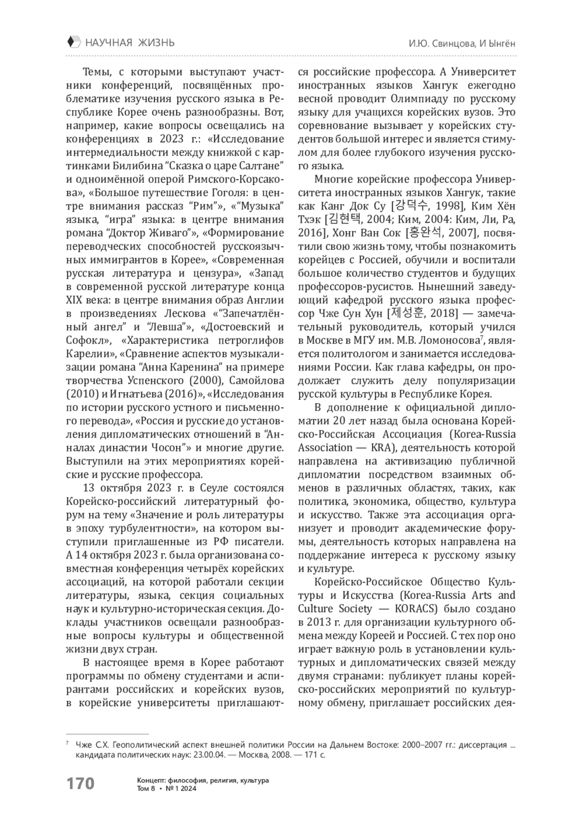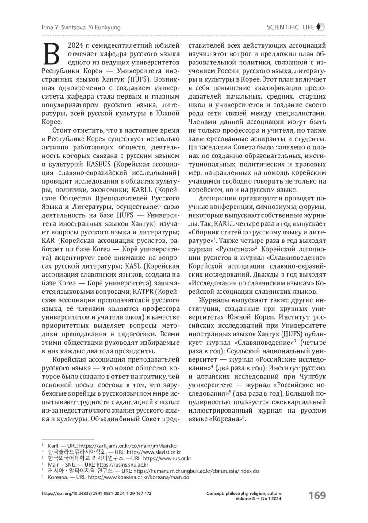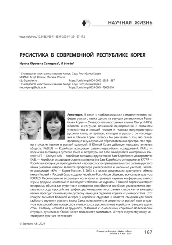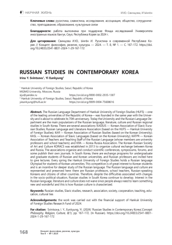В связи с приближающимся семидесятилетием кафедры русского языка одного из ведущих университетов Республики Корея — Университета иностранных языков Хангук (HUFS), юбилеем институции, возникшей одновременно с созданием университета и ставшей первым и главным популяризатором русского языка, литературы, культуры и русского регионоведения в Южной Корее, хотелось бы рассказать о том, что сейчас происходит в культурном и образовательном пространстве страны с русским языком и русской культурой. В Южной Корее действует несколько активных обществ: KASEUS — Корейская ассоциация славяно-евразийских исследований; KARLL — Корейская ассоциация русского языка и литературы (на базе Университета иностранных языков HUFS — Хангук); KAR — Корейская ассоциация русистов (на базе Корейского университета); KASL — Корейская ассоциация славянских языков (на базе Корейского университета); KATPR — Корейская ассоциация преподавателей и профессорско-преподавательского состава русского языка (членами которой являются профессора университетов и школьные учителя). Работает ассоциация «КРА — Корея-Россия». В 2013 г. с целью организации культурного обмена между Кореей и Россией было создано Корейско-Российское общество искусства и культуры KORACS. Перечисленные ассоциации организуют и проводят научные конференции, симпозиумы, форумы; некоторые из них издают собственные журналы. В Южной Корее существуют программы обмена для студентов и аспирантов российских и корейских университетов, приглашаются сюда и российские профессора. Университет иностранных языков Хангук ежегодно весной проводит олимпиаду по русскому языку для студентов корейских университетов. Этот конкурс вызывает большой интерес у корейских студентов и является стимулом для более глубокого изучения русского языка. Здесь представлены и сохраняются русский язык и культура: есть российские профессора, учителя школ, русскоязычные корейцы и граждане других стран. Поэтому, несмотря на трудности, связанные с изменениями социально-политической ситуации, русистика в Южной Корее продолжает развиваться. Интерес к русскому языку, литературе и культуре не исчезает.