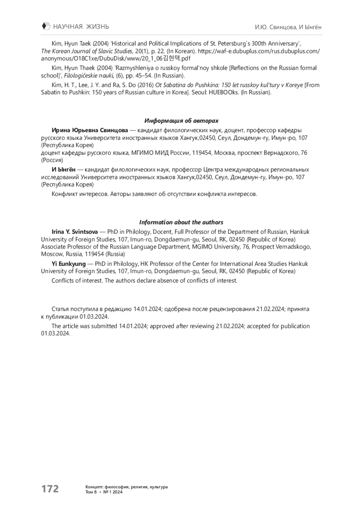 Для цитирования: Гринина Е. А., Ким А. А. Научная конференция «Язык и культура» в Томском государственном университете. Концепт: философия, религия, культура. 2024;8(1):163-166. https://doi. org/10.24833/2541-8831-2024-1-29-163-166