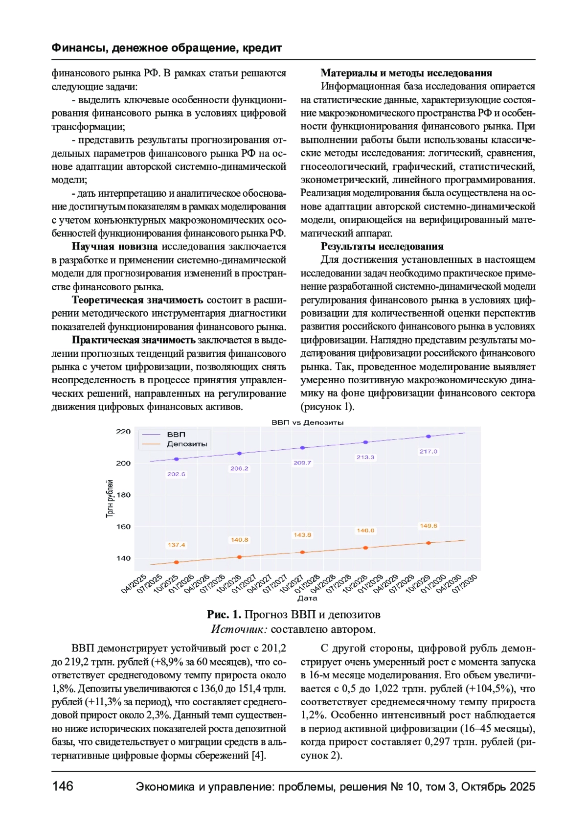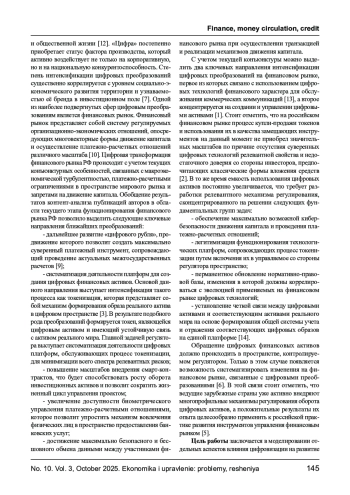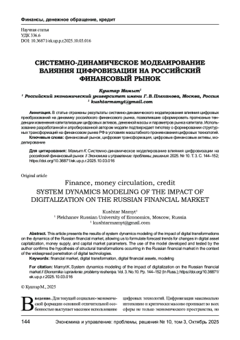 В статье отражены результаты системно-динамического моделирования влияния цифровых преобразований на динамику российского финансового рынка, позволившие сформировать прогнозные тенденции изменения капитализации цифровых активов, денежной массы и параметров рынка капитала. Использование разработанной и апробированной автором модели подтверждает гипотезу о формировании структурных трансформаций на финансовом рынке РФ в условиях масштабного проникновения цифровых технологий.