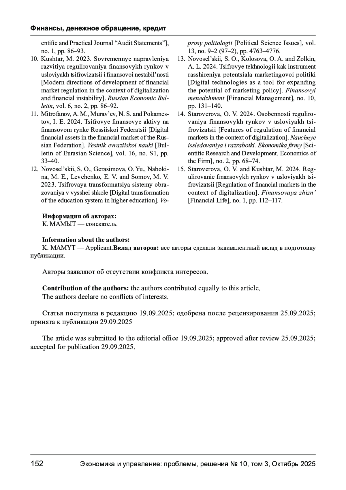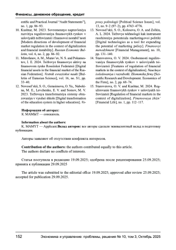 10. Куштар М. Современные направления развития регулирования финансовых рынков в условиях цифровизации и финансовой нестабильности // Russian Economic Bulletin. - 2023. - Т. 6. - № 2. - С. 86-92. EDN: DLISYD