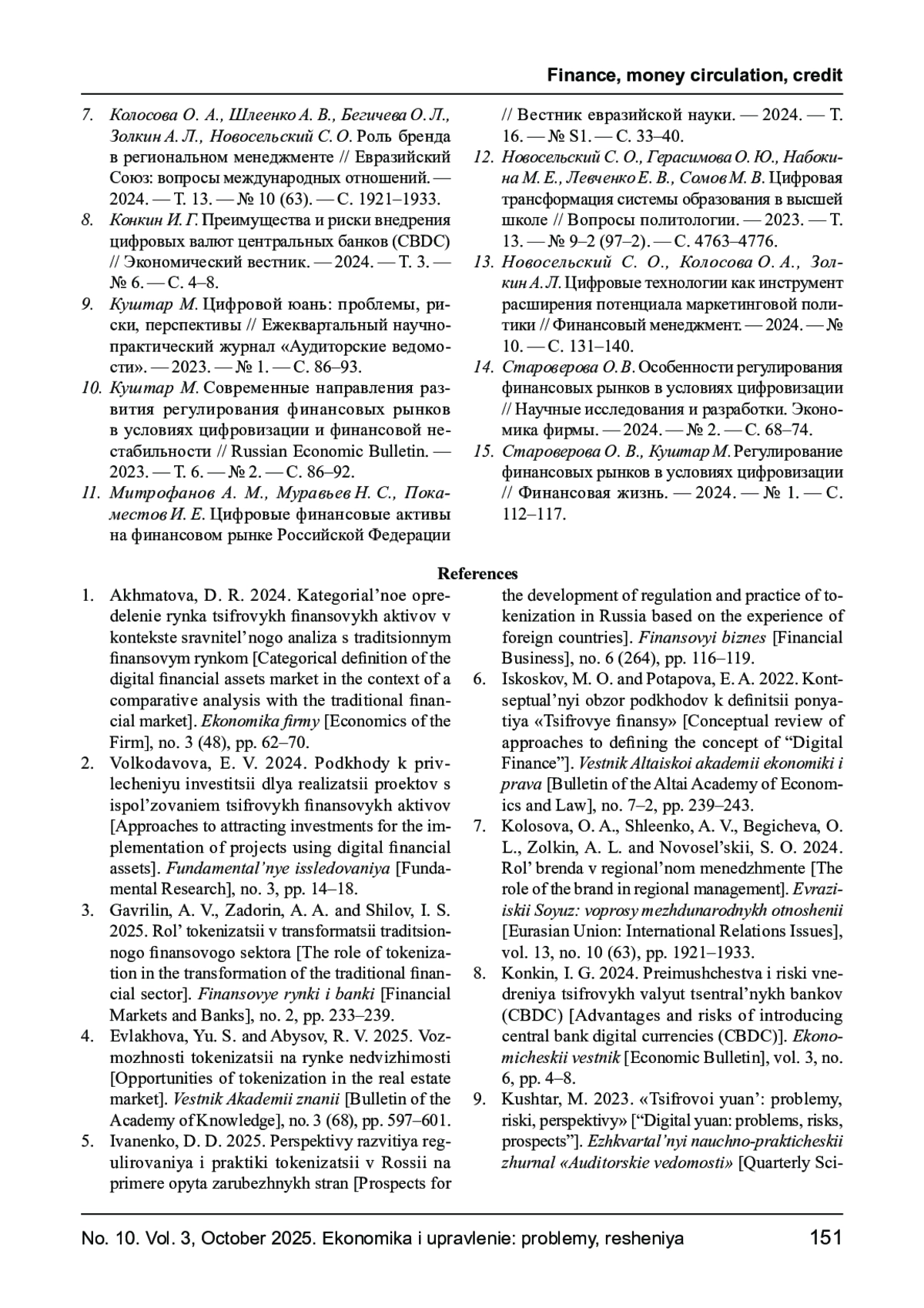 15. Староверова О. В., Куштар М. Регулирование финансовых рынков в условиях цифровизации // Финансовая жизнь. - 2024. - № 1. - С. 112-117. EDN: RXGATX