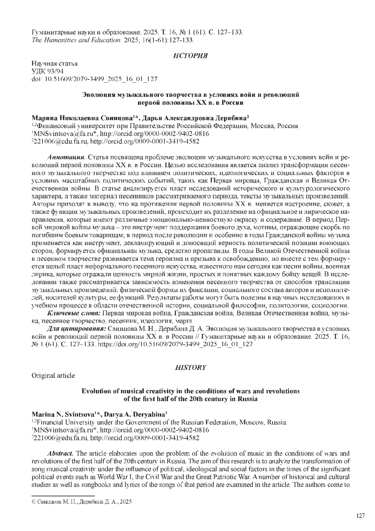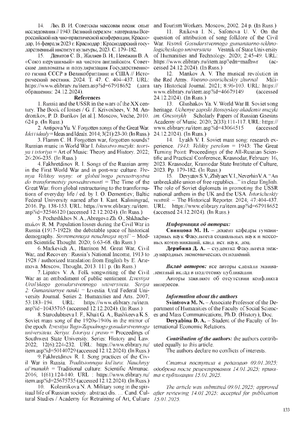 11. Райкова И. Н., Сафонова У. В. К вопросу атрибуции песенного фольклора Гражданской войны // Вестник Государственного гуманитарно-технологического университета. 2020. № 2. С 45-49. URL: item.asp?edn= (дата обращения 24.12.2024). EDN: MAFHWR