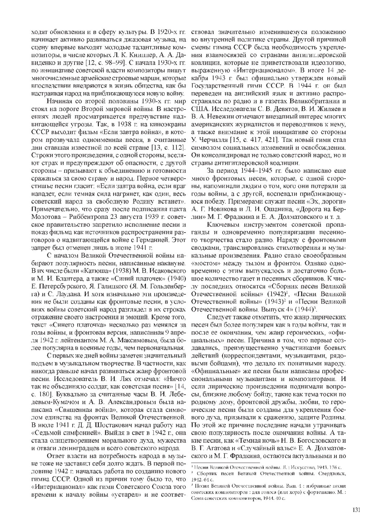 14. Лях В. И. Советская массовая песня: опыт исследования // 1943: Великий перелом: материалы Всероссийской научно-практической конференции, Краснодар, 16 февраля 2023 г. Краснодар: Краснодарский государственный институт культуры, 2023. С. 179-182. EDN: DVFQTM