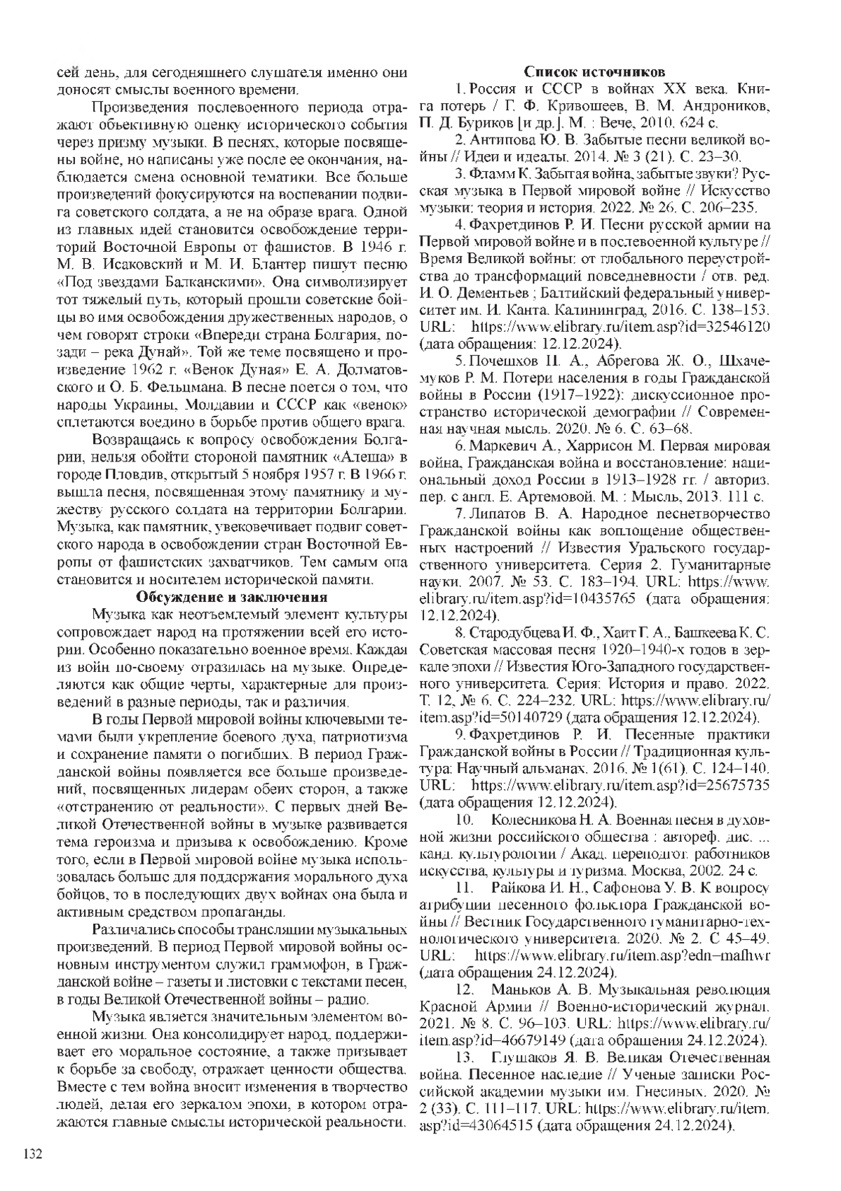 13. Глушаков Я. В. Великая Отечественная война. Песенное наследие // Ученые записки Российской академии музыки им. Гнесиных. 2020. № 2 (33). С. 111-117. URL: item.asp?id=43064515 (дата обращения 24.12.2024). EDN: MGFTZO