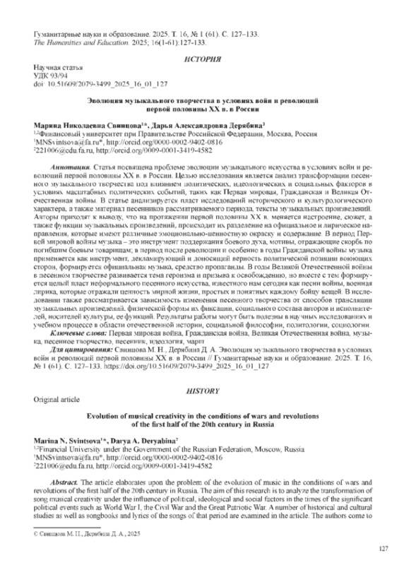 Статья посвящена проблеме эволюции музыкального искусства в условиях войн и революций первой половины XX в. в России. Целью исследования является анализ трансформации песенного музыкального творчества под влиянием политических, идеологических и социальных факторов в условиях масштабных политических событий, таких как Первая мировая, Гражданская и Великая Отечественная войны. В статье анализируется пласт исследований исторического и культурологического характера, а также материал песенников рассматриваемого периода, тексты музыкальных произведений. Авторы приходят к выводу, что на протяжении первой половины XX в. меняется настроение, сюжет, а также функции музыкальных произведений, происходит их разделение на официальное и лирическое направления, которые имеют различные эмоционально-ценностную окраску и содержание. В период Первой мировой войны музыка - это инструмент поддержания боевого духа, мотивы, отражающие скорбь по погибшим боевым товарищам; в период после революции и особенно в годы Гражданской войны музыка применяется как инструмент, декламирующий и доносящий верность политической позиции воюющих сторон, формируется официальная музыка, средство пропаганды. В годы Великой Отечественной войны в песенном творчестве развивается тема героизма и призыва к освобождению, но вместе с тем формируется целый пласт неформального песенного искусства, известного нам сегодня как песни войны, военная лирика, которые отражали ценность мирной жизни, простых и понятных каждому бойцу вещей. В исследовании также рассматривается зависимость изменения песенного творчества от способов трансляции музыкальных произведений, физической формы их фиксации, социального состава авторов и исполнителей, носителей культуры, ее функций. Результаты работы могут быть полезны в научных исследованиях и учебном процессе в области отечественной истории, социальной философии, политологии, социологии.