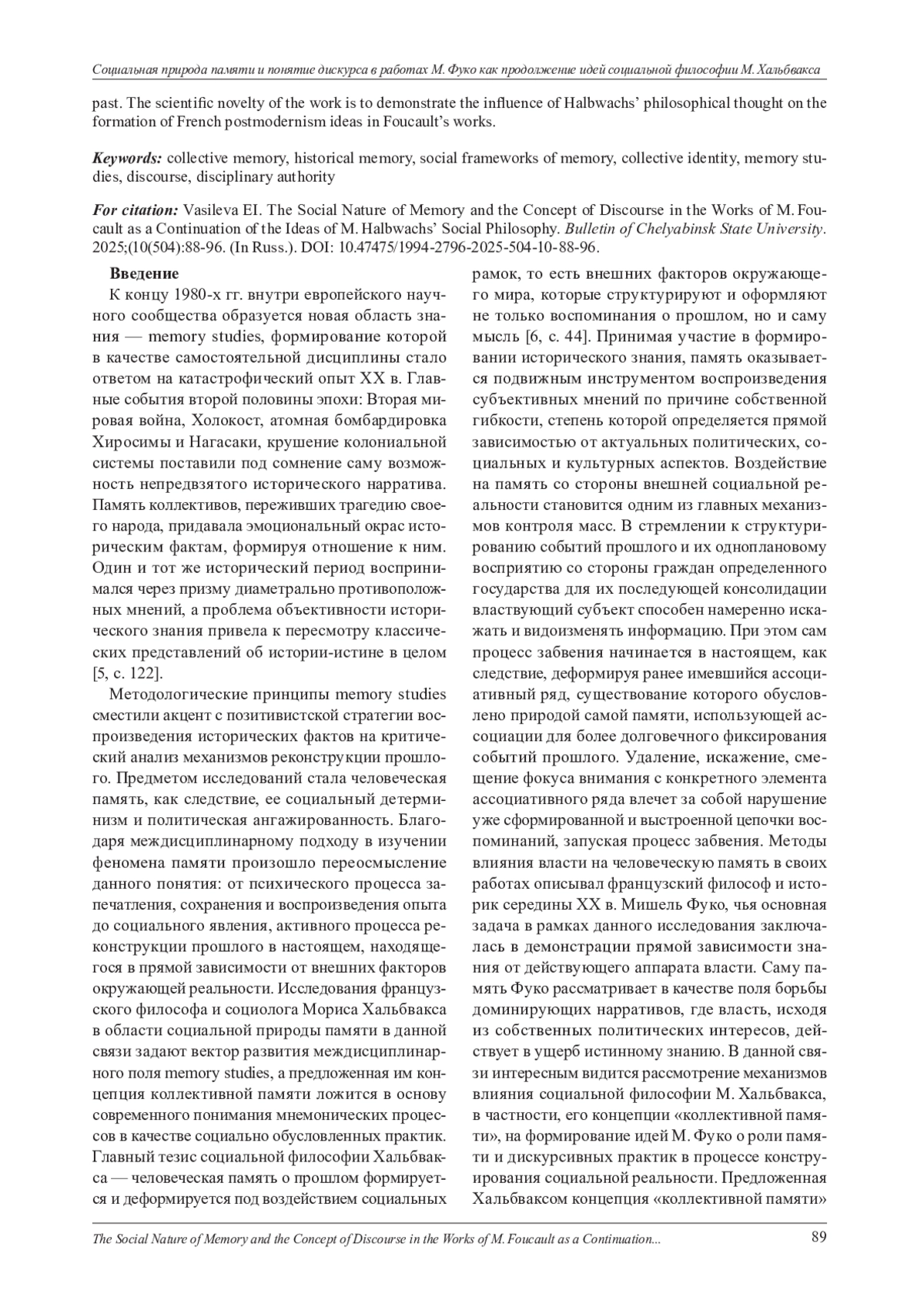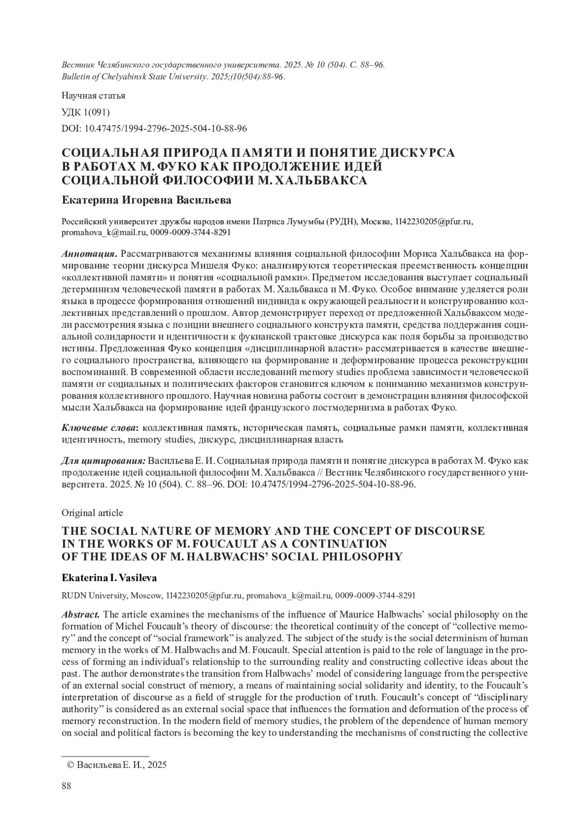 Рассматриваются механизмы влияния социальной философии Мориса Хальбвакса на формирование теории дискурса Мишеля Фуко: анализируются теоретическая преемственность концепции «коллективной памяти» и понятия «социальной рамки». Предметом исследования выступает социальный детерминизм человеческой памяти в работах М. Хальбвакса и М. Фуко. Особое внимание уделяется роли языка в процессе формирования отношений индивида к окружающей реальности и конструированию коллективных представлений о прошлом. Автор демонстрирует переход от предложенной Хальбваксом модели рассмотрения языка с позиции внешнего социального конструкта памяти, средства поддержания социальной солидарности и идентичности к фукианской трактовке дискурса как поля борьбы за производство истины. Предложенная Фуко концепция «дисциплинарной власти» рассматривается в качестве внешнего социального пространства, влияющего на формирование и деформирование процесса реконструкции воспоминаний. В современной области исследований memory studies проблема зависимости человеческой памяти от социальных и политических факторов становится ключом к пониманию механизмов конструирования коллективного прошлого. Научная новизна работы состоит в демонстрации влияния философской мысли Хальбвакса на формирование идей французского постмодернизма в работах Фуко.