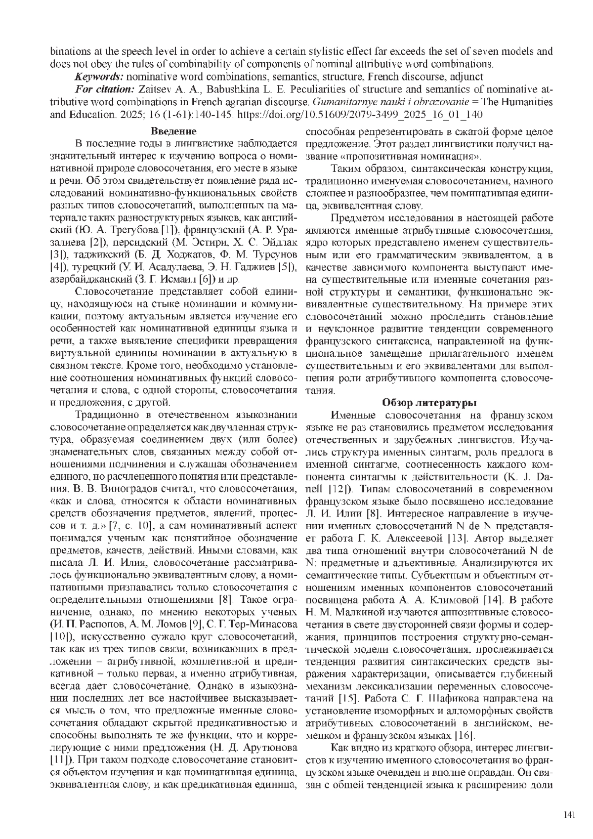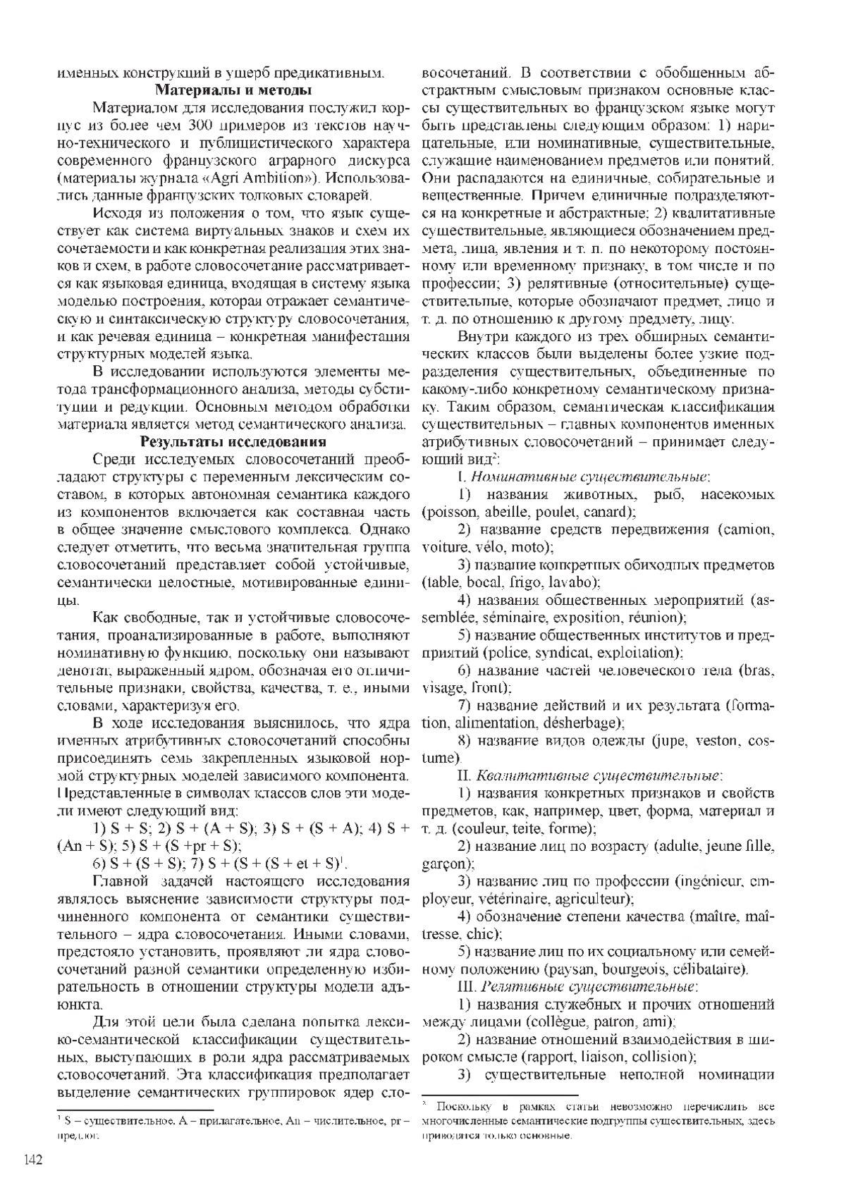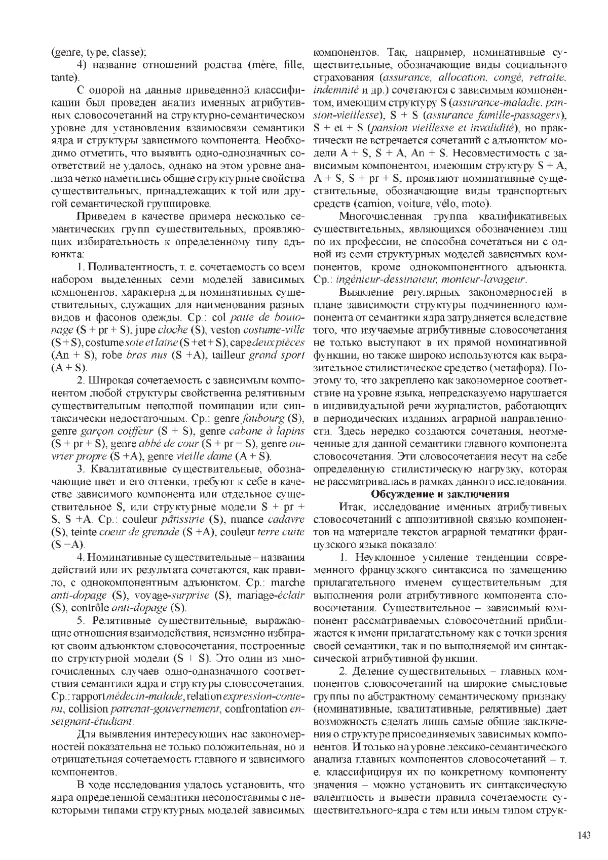Настоящее исследование направлено на выяснение зависимости структуры подчиненного компонента именных атрибутивных словосочетаний, употребляемых в текстах современного франкоязычного аграрного дискурса, от семантики существительного, являющегося ядром этих словосочетаний. Актуальность работы обусловлена необходимостью дальнейшего изучения тенденции развития французского синтаксиса, направленной на увеличение числа адъективированных существительных, выполняющих роль атрибутивного компонента именных словосочетаний. В результате анализа материала корпусных данных, составивших более 300 примеров употребления словосочетаний, были определены семь закрепленных языковой нормой структурных моделей зависимого компонента. Кроме того, была выявлена регулярная взаимосвязь между конкретной семантикой определенных групп ядер и синтаксической структурой создаваемых ими словосочетаний. Отмечено, что окказиональные совместные употребления ядер и зависимых компонентов словосочетаний на уровне речи в целях достижения определенного стилистического эффекта далеко превосходят набор из семи моделей и не подчиняются правилам сочетаемости компонентов именных атрибутивных словосочетаний.