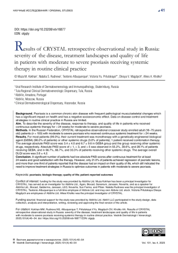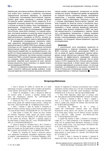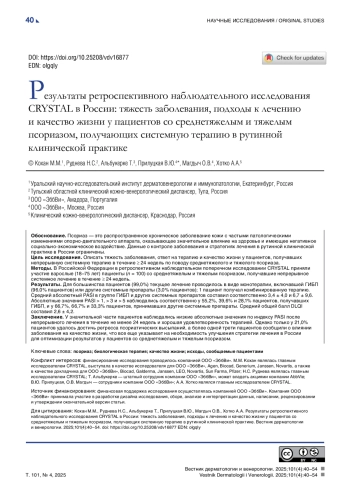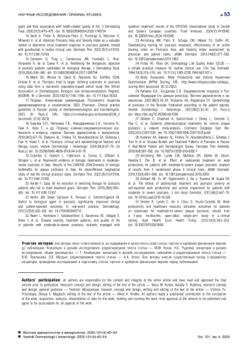 28. Kubanov AA, Bakulev AL, Fitileva TV, Novoderezhkina E, Gilloteau I, Tian H, et al. Disease Burden and Treatment Patterns of Psoriasis in Russia: A Real-World Patient and Dermatologist Survey. Dermatol Ther (Heidelb). 2018;8(4):581-592. DOI: 10.1007/s13555-018-0262-1