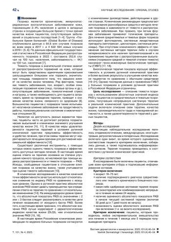 Обоснование. Псориаз — это распространенное хроническое заболевание кожи с частыми патологическими изменениями опорно-двигательного аппарата, оказывающее значительное влияние на здоровье и имеющее негативное социально-экономическое воздействие. Данные о контроле заболевания и стратегиях лечения в рутинной клинической практике в России ограничены.