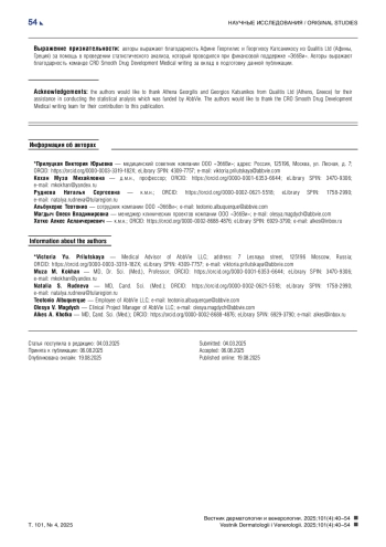 Заключение. У значительной части пациентов наблюдались низкие абсолютные значения по индексу PASI после непрерывного лечения в течение не менее 24 недель и хорошая удовлетворенность терапией. Однако только у 21,0% пациентов удалось достичь регресса псориатических высыпаний, а более одной трети пациентов сообщили о влиянии заболевания на качество жизни, что все еще указывает на необходимость улучшения стратегии лечения в России для оптимизации результатов у пациентов со среднетяжелым и тяжелым псориазом.
