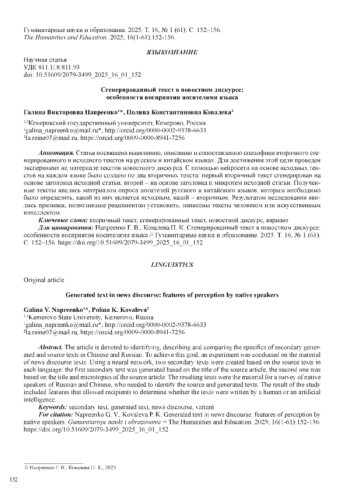 Статья посвящена выявлению, описанию и сопоставлению специфики вторичного сгенерированного и исходного текстов на русском и китайском языках. Для достижения этой цели проведен эксперимент на материале текстов новостного дискурса. С помощью нейросети на основе исходных текстов на каждом языке было создано по два вторичных текста: первый вторичный текст сгенерирован на основе заголовка исходной статьи, второй - на основе заголовка и микротем исходной статьи. Полученные тексты явились материалом опроса носителей русского и китайского языков, которым необходимо было определить, какой из них является исходным, какой - вторичным. Результатом исследования явились признаки, позволившие реципиентам установить, написаны тексты человеком или искусственным интеллектом.