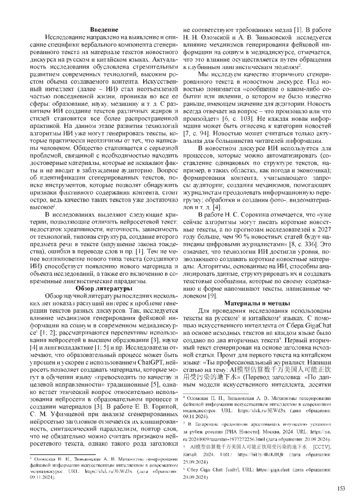 Исследование направлено на выявление и описание специфики вербального компонента сгенерированного текста на материале текстов новостного дискурса на русском и китайском языках. Актуальность исследования обусловлена стремительным развитием современных технологий, высоким ростом объема создаваемого контента. Искусственный интеллект (далее - ИИ) стал неотъемлемой частью повседневной жизни, проникая во все ее сферы: образование, науку, медицину и т. д.