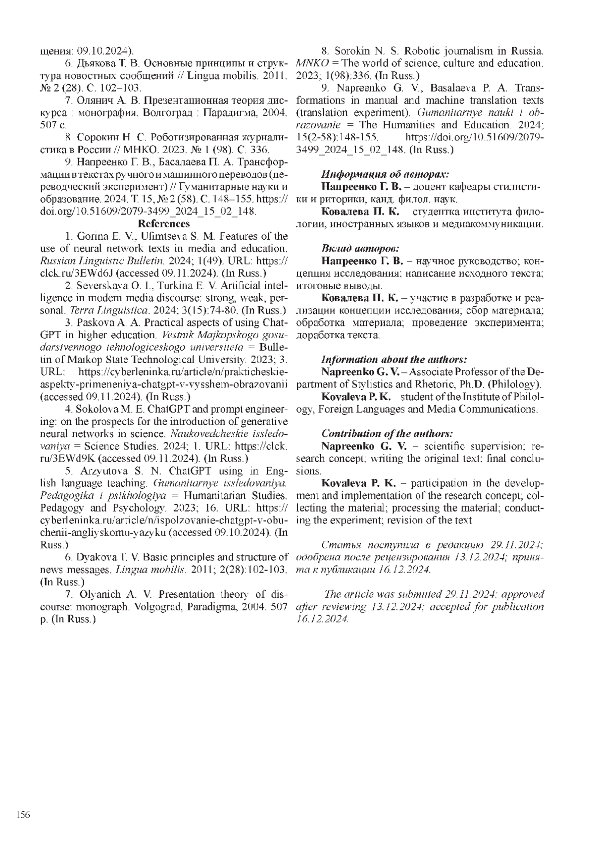 9. Напреенко Г. В., Басалаева П. А. Трансформации в текстах ручного и машинного переводов (переводческий эксперимент) // Гуманитарные науки и образование. 2024. Т. 15, № 2 (58). С. 148-155. DOI: 10.51609/2079-3499_2024_15_02_148 EDN: CCTJAE