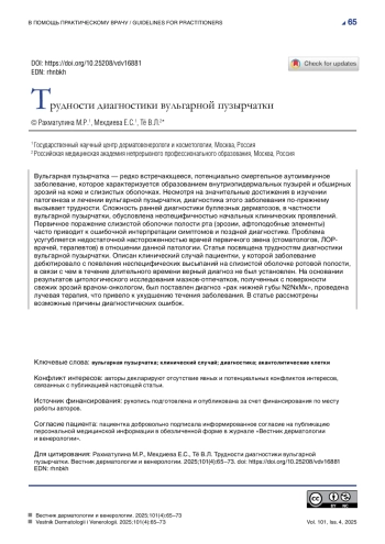 13. Гайнулин Ш.М., Гребенюк В.Н., Резникова М.М., Цацаниди М.А. Вульгарная пузырчатка (клиническое наблюдение атипичного случая). Клиническая дерматология и венерология. 2011;9(2):40-44.