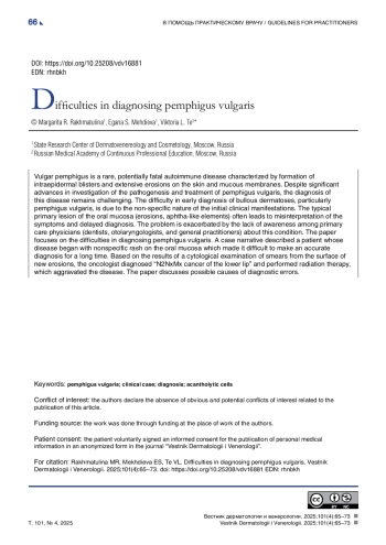 Вульгарная пузырчатка — редко встречающееся, потенциально смертельное аутоиммунное заболевание, которое характеризуется образованием внутриэпидермальных пузырей и обширных эрозий на коже и слизистых оболочках. Несмотря на значительные достижения в изучении патогенеза и лечении вульгарной пузырчатки, диагностика этого заболевания по-прежнему вызывает трудности. Сложность ранней диагностики буллезных дерматозов, в частности вульгарной пузырчатки, обусловлена неспецифичностью начальных клинических проявлений. Первичное поражение слизистой оболочки полости рта (эрозии, афтоподобные элементы) часто приводит к ошибочной интерпретации симптомов и поздней диагностике. Проблема усугубляется недостаточной настороженностью врачей первичного звена (стоматологов, ЛОРврачей, терапевтов) в отношении данной патологии. Статья посвящена трудностям диагностики вульгарной пузырчатки. Описан клинический случай пациентки, у которой заболевание дебютировало с появления неспецифических высыпаний на слизистой оболочке ротовой полости, в связи с чем в течение длительного времени верный диагноз не был установлен. На основании результатов цитологического исследования мазков-отпечатков, полученных с поверхности свежих эрозий врачом-онкологом, был поставлен диагноз «рак нижней губы N2NxMx», проведена лучевая терапия, что привело к ухудшению течения заболевания. В статье рассмотрены возможные причины диагностических ошибок.