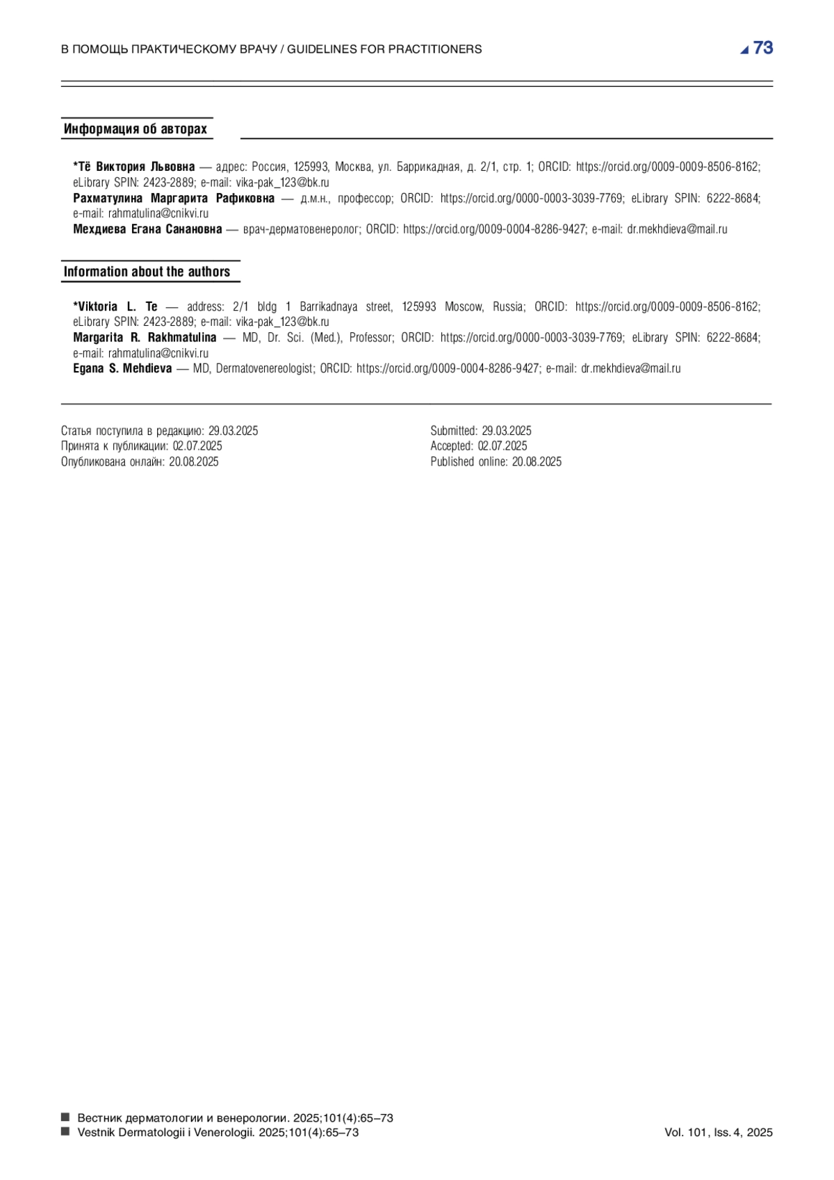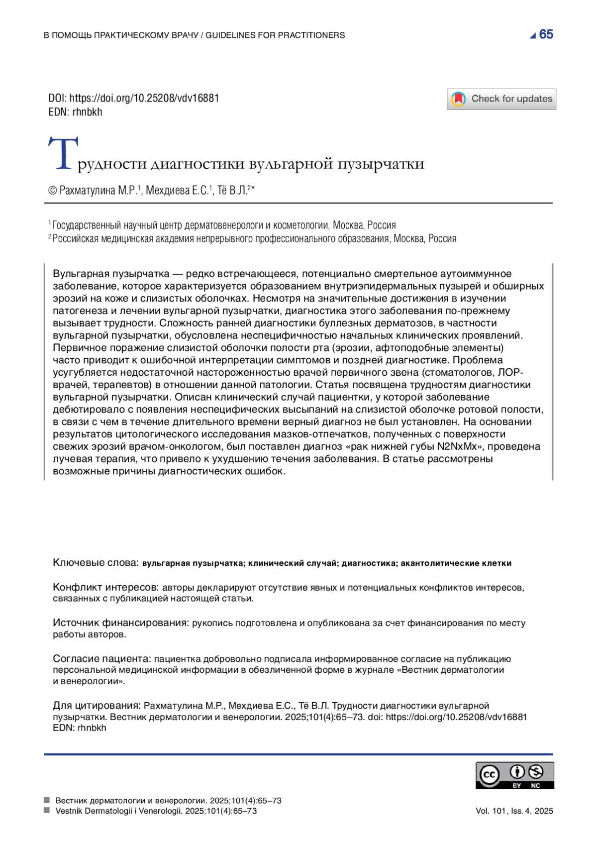 15. Сердюкова Е.А., Родин А.Ю., Еремина Г.В. Случай ошибки в диагностике акантолитической пузырчатки. Российский журнал кожных и венерических болезней. 2015;18(4):41-44.