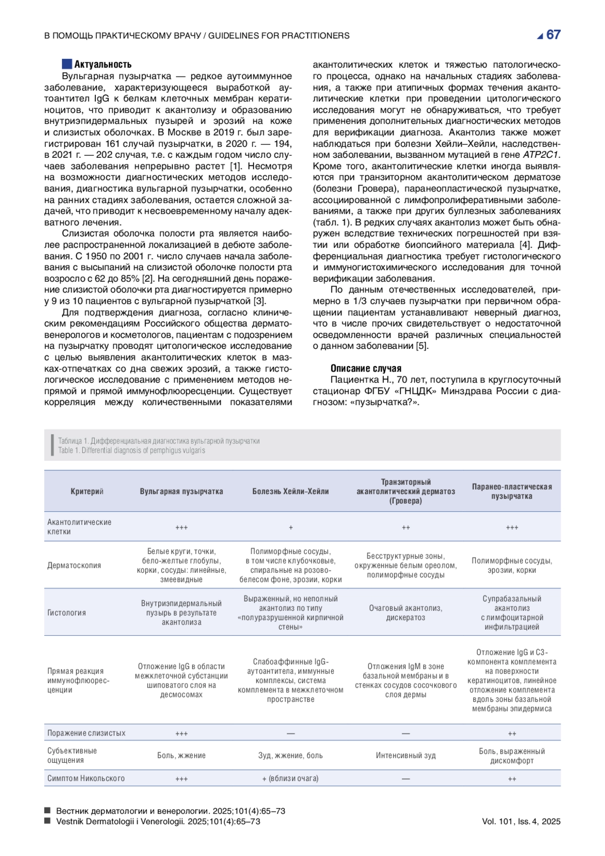 Вульгарная пузырчатка — редкое аутоиммунное заболевание, характеризующееся выработкой аутоантител IgG к белкам клеточных мембран кератиноцитов, что приводит к акантолизу и образованию внутриэпидермальных пузырей и эрозий на коже и слизистых оболочках. В Москве в 2019 г. был зарегистрирован 161 случай пузырчатки, в 2020 г. — 194, в 2021 г. — 202 случая, т. е. с каждым годом число случаев заболевания непрерывно растет [1]. Несмотря на возможности диагностических методов исследования, диагностика вульгарной пузырчатки, особенно на ранних стадиях заболевания, остается сложной задачей, что приводит к несвоевременному началу адекватного лечения.
