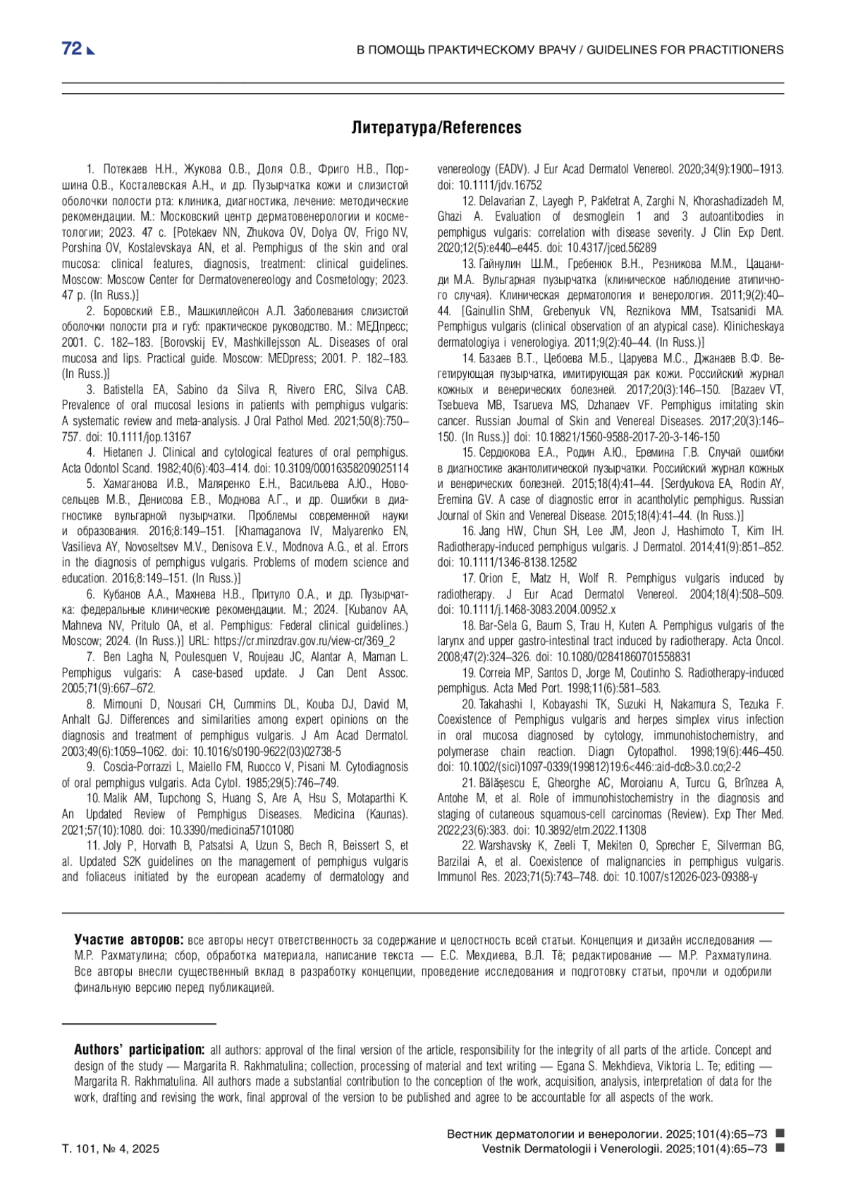 6. Кубанов А.А., Махнева Н.В., Притуло О.А., и др. Пузырчатка: федеральные клинические рекомендации. М.; 2024. URL: https://cr.minzdrav.gov.ru/view-cr/369_2.