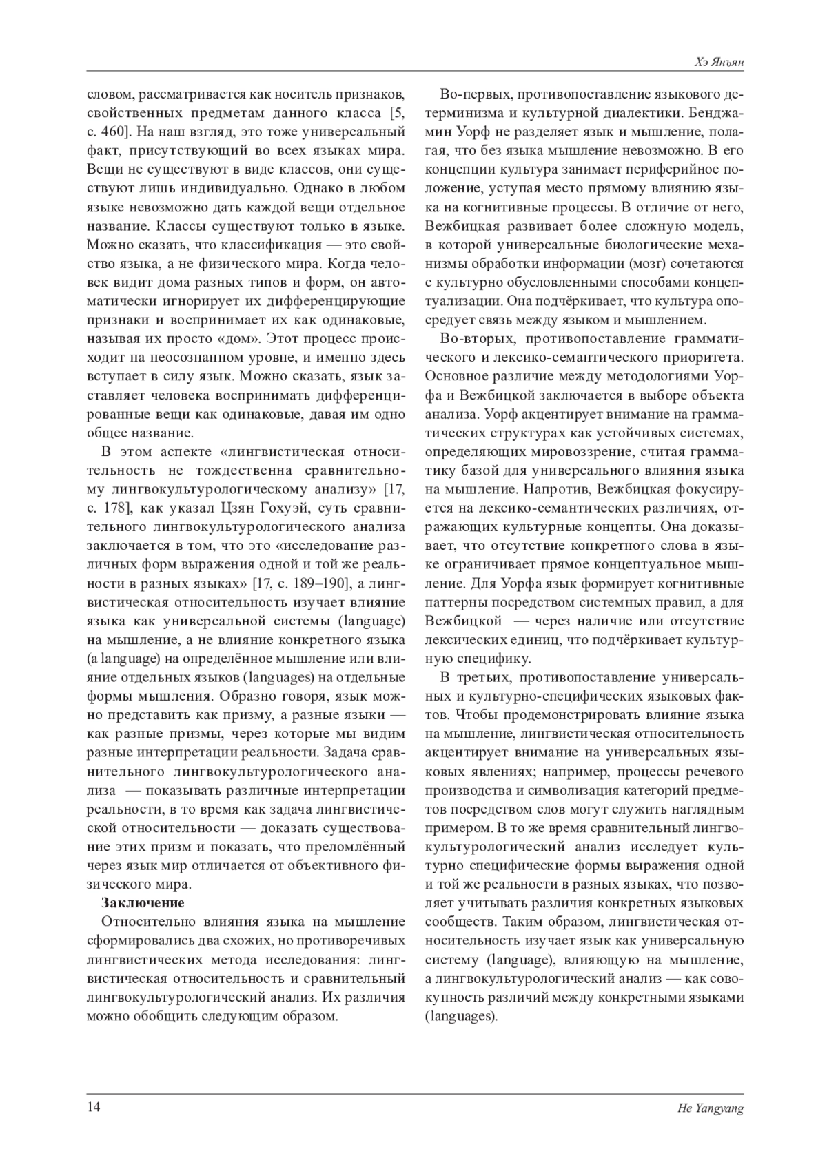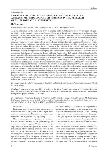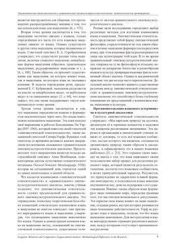 Вопрос взаимосвязи языка и мышления породил два метода исследования: лингвистическую относительность и сравнительный лингвокультурологический анализ. Однако в научной литературе нередко наблюдается их смешение. Актуальность исследования заключается в необходимости чёткого разграничения данных методов и доказательства их принципиальных различий. На примере концепций Бенджамина Ли Уорфа (основоположника гипотезы лингвистической относительности) и Анны Вежбицкой (представителя сравнительного лингвокультурологического анализа) проведён сопоставительный анализ их теоретических и методологических контрастов. Это позволило выявить, как каждый метод объясняет взаимосвязь языка и мышления и какие методы используются в соответствующих исследованиях. Новизна работы состоит в трёх аспектах: 1) системное разграничение постулатов лингвистической относительности и сравнительного лингвокультурологического анализа; 2) выявление ключевых различий между методами на конкретных примерах; 3) определение языковых универсалий, подходящих для подтверждения влияния языка на мышление в рамках гипотезы лингвистической относительности. Результаты показали, что оба метода разделяют базовый тезис о неразрывной связи языка и концептуального мышления: без языка человеческое мышление не может существовать как концептуальное явление. Однако между ними существуют принципиальные различия в понимании роли культуры. Лингвистическая относительность сосредотачивается на грамматических конструкциях и языковых шаблонах, демонстрируя их влияние на мировоззрение и когнитивные процессы. В свою очередь, сравнительный лингвокультурологический анализ подчёркивает влияние языка на мышление через специфику лексики и семантики, характерных для отдельных лингвокультурных групп. Лингвистическая относительность утверждает, что необходимо изучать влияние языка как универсальной системы (language) на мышление, а не влияние конкретного языка (a language) на определённое мышление или отдельных языков (languages) на отдельные формы мышления. Сравнительный лингвокультурологический анализ, напротив, обращает внимание на культурно-специфические языковые факты. Причина таких различий заключается в том, что лингвистическая относительность - это философская концепция, использующая языковые факты для доказательства влияния языка на мышление, тогда как сравнительный лингвокультурологический анализ представляет собой метод исследования языка, направленный на выявление его культурного и лингвистического разнообразия.