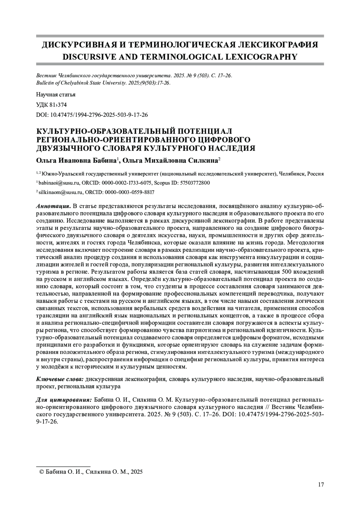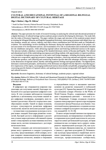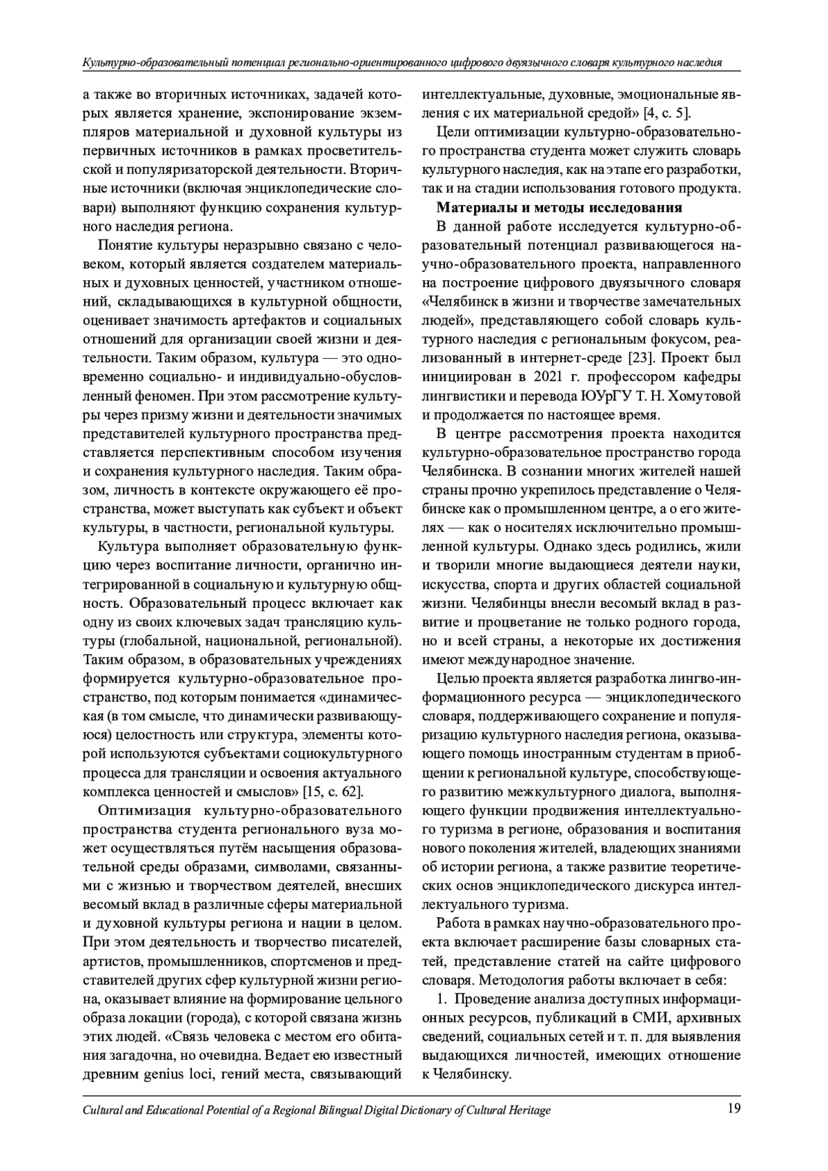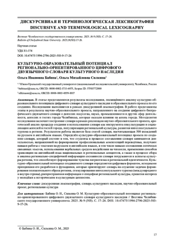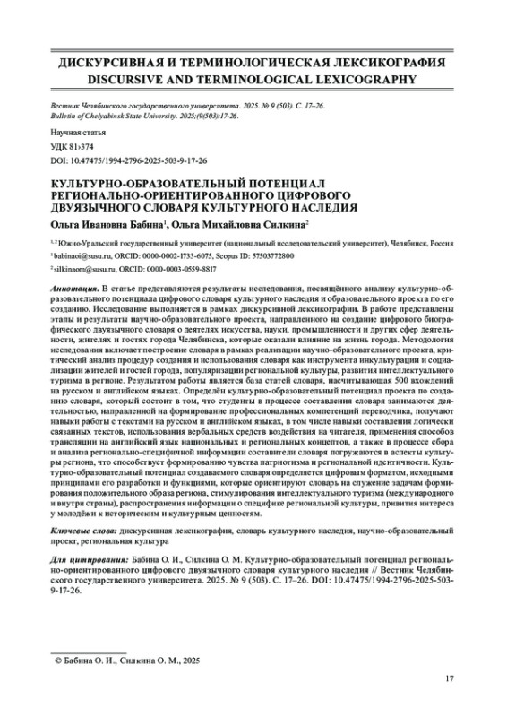 В статье представляются результаты исследования, посвящённого анализу культурно-образовательного потенциала цифрового словаря культурного наследия и образовательного проекта по его созданию. Исследование выполняется в рамках дискурсивной лексикографии. В работе представлены этапы и результаты научно-образовательного проекта, направленного на создание цифрового биографического двуязычного словаря о деятелях искусства, науки, промышленности и других сфер деятельности, жителях и гостях города Челябинска, которые оказали влияние на жизнь города. Методология исследования включает построение словаря в рамках реализации научно-образовательного проекта, критический анализ процедур создания и использования словаря как инструмента инкультурации и социализации жителей и гостей города, популяризации региональной культуры, развития интеллектуального туризма в регионе. Результатом работы является база статей словаря, насчитывающая 500 вхождений на русском и английском языках. Определён культурно-образовательный потенциал проекта по созданию словаря, который состоит в том, что студенты в процессе составления словаря занимаются деятельностью, направленной на формирование профессиональных компетенций переводчика, получают навыки работы с текстами на русском и английском языках, в том числе навыки составления логически связанных текстов, использования вербальных средств воздействия на читателя, применения способов трансляции на английский язык национальных и региональных концептов, а также в процессе сбора и анализа регионально-специфичной информации составители словаря погружаются в аспекты культуры региона, что способствует формированию чувства патриотизма и региональной идентичности. Культурно-образовательный потенциал создаваемого словаря определяется цифровым форматом, исходными принципами его разработки и функциями, которые ориентируют словарь на служение задачам формирования положительного образа региона, стимулирования интеллектуального туризма (международного и внутри страны), распространения информации о специфике региональной культуры, привития интереса у молодёжи к историческим и культурным ценностям.