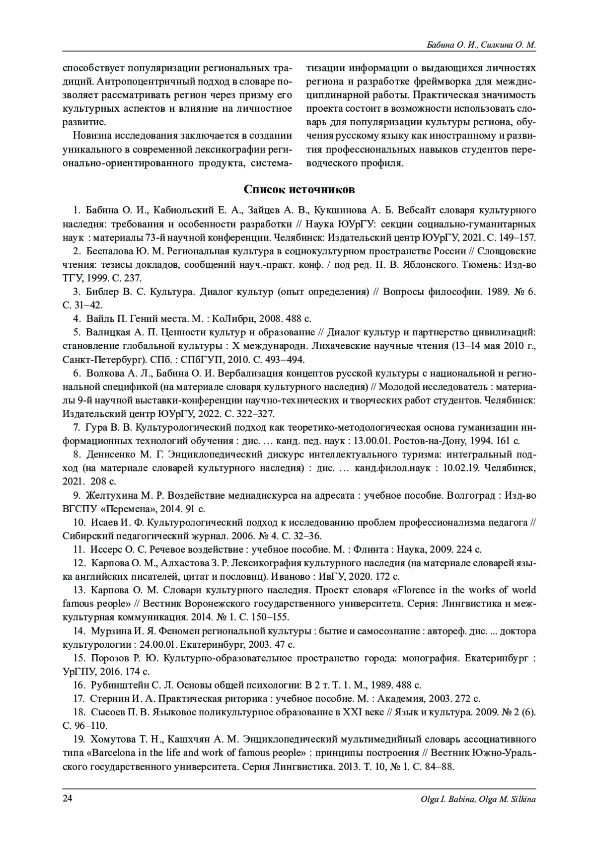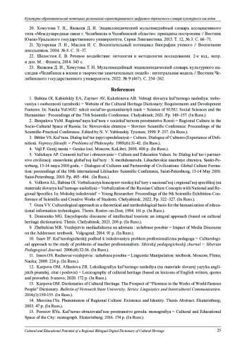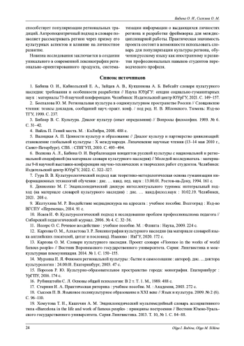 6. Волкова А. Л., Бабина О. И. Вербализация концептов русской культуры с национальной и региональной спецификой (на материале словаря культурного наследия) // Молодой исследователь: материалы 9-й научной выставки-конференции научно-технических и творческих работ студентов. Челябинск: Издательский центр ЮУрГУ, 2022. С. 322-327. EDN: HQLHMG