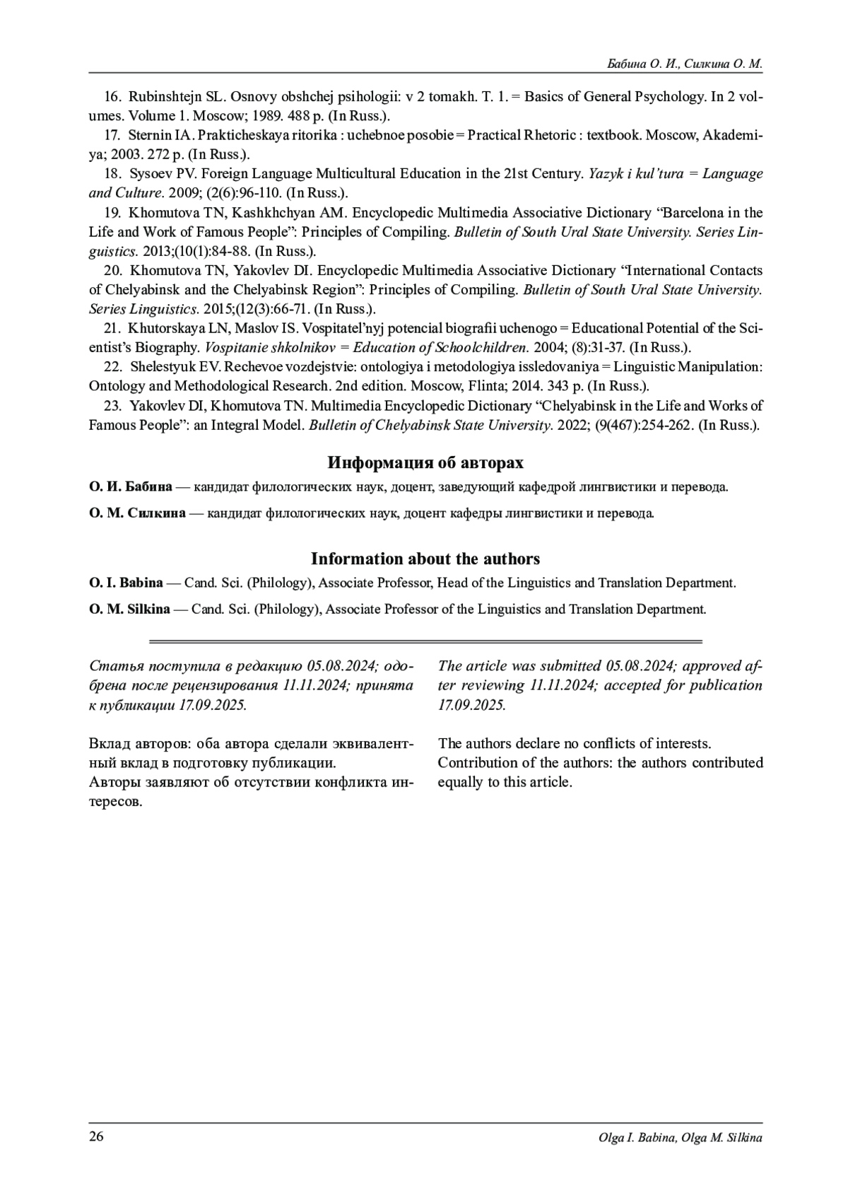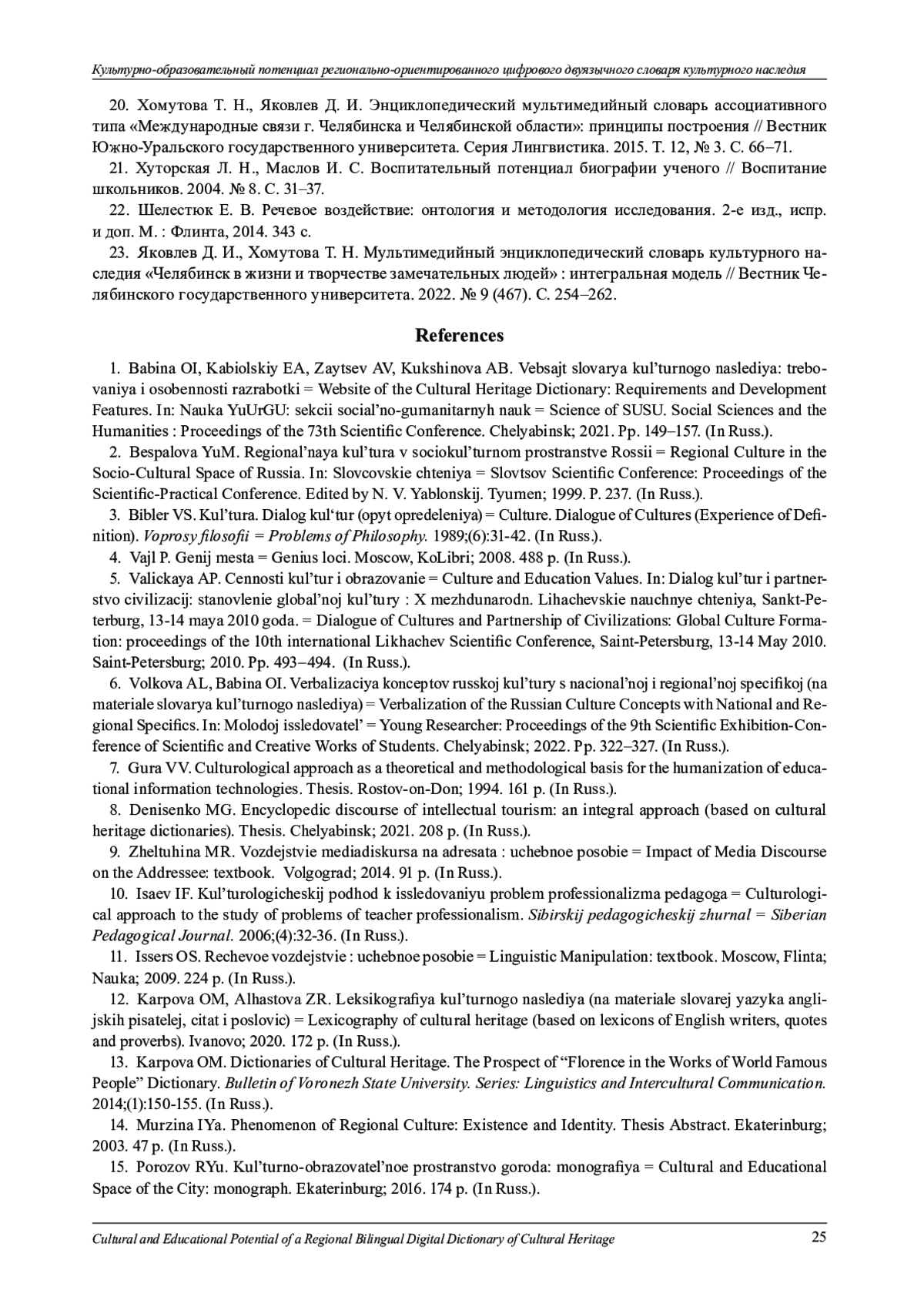 23. Яковлев Д. И., Хомутова Т. Н. Мультимедийный энциклопедический словарь культурного наследия “Челябинск в жизни и творчестве замечательных людей”: интегральная модель // Вестник Челябинского государственного университета. 2022. № 9 (467). С. 254-262.