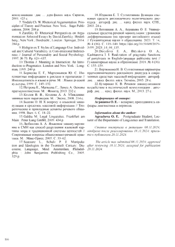 19. Ветошкин А. А., Аграшева О. Е. Универсальные средства речевой манипуляции: уровневая дифференциация (на примере английского языка) // Гуманитарные науки и образование. 2023. Т. 14, № 4 (56). С. 135-140. DOI: 10.51609/2079-3499_2023_14_04_135 EDN: EBOQHI