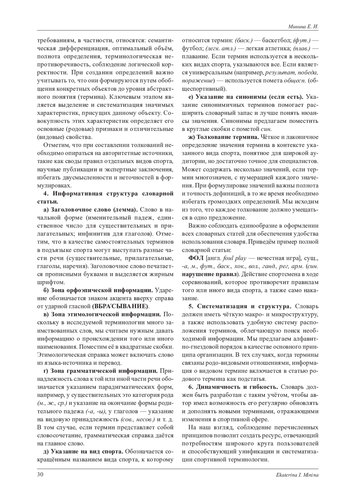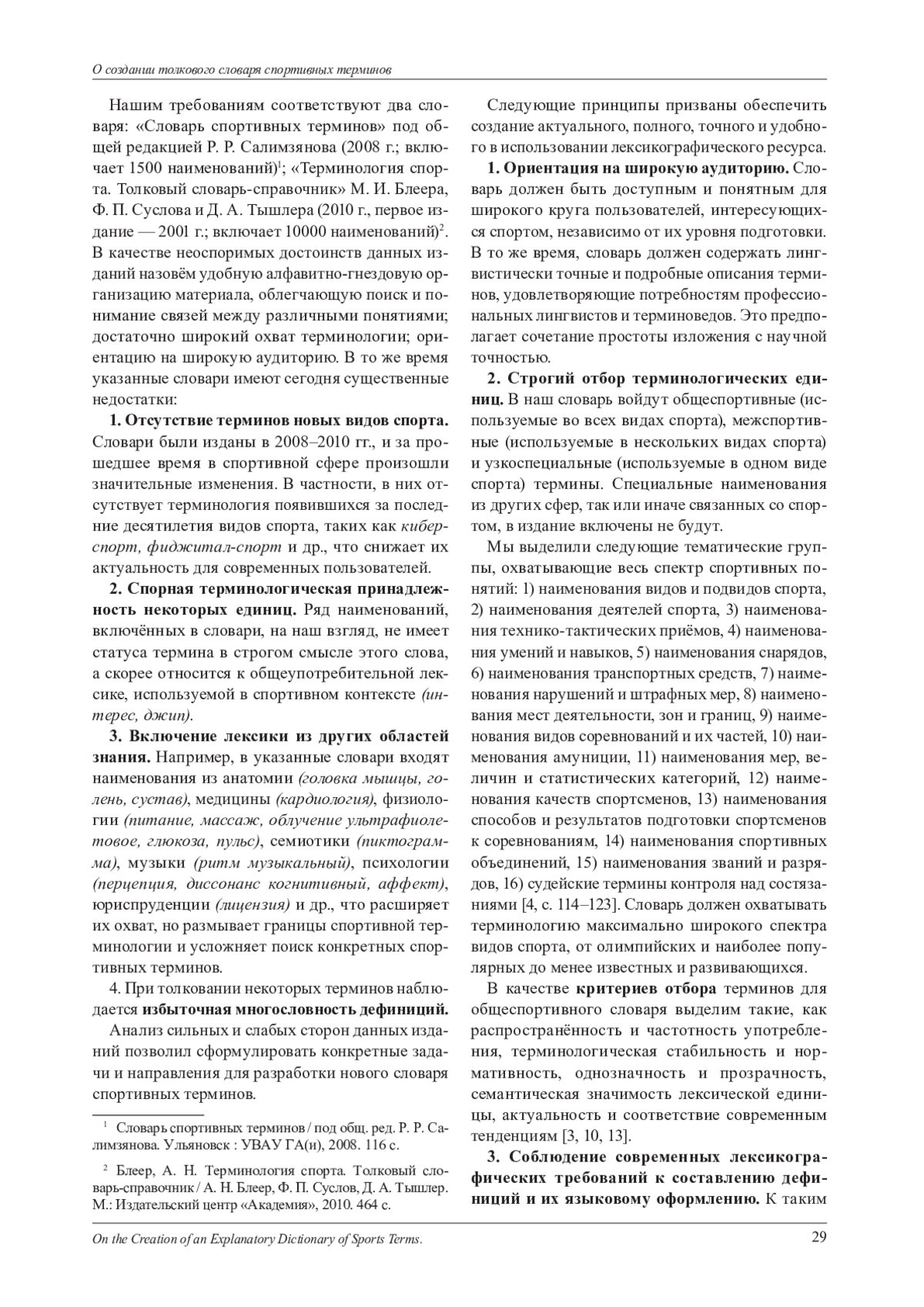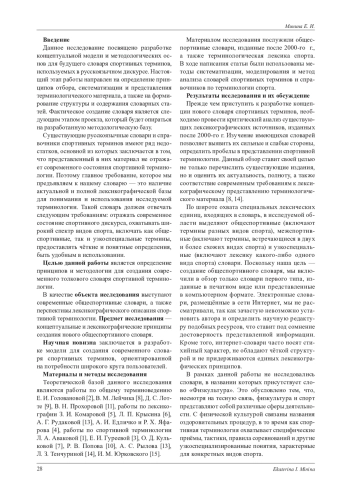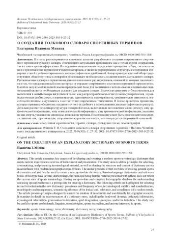 В статье рассматриваются ключевые аспекты разработки и создания современного спортивного терминологического словаря, отвечающего актуальным требованиям как с точки зрения содержания, так и с точки зрения оформления. Исследование направлено на определение принципов отбора, систематизации и представления терминологического материала, а также на формирование структуры и содержания словарных статей с учётом современных лексикографических требований. Автор приводит краткий обзор существующих общеспортивных словарей и обосновывает необходимость создания нового, актуального словаря. Русскоязычные словари и справочники данного типа имеют ряд недостатков, основной из которых заключается в том, что представленный в них материал не отражает современного состояния спортивной терминологии. Наличие актуальной и полной лексикографической базы для понимания и использования специальных наименований является необходимым условием для создания словаря. В качестве критериев отбора терминов для включения в новый словарь выделяются такие, как распространённость и частотность употребления, терминологическая стабильность и нормативность, однозначность и прозрачность, семантическая значимость лексической единицы, актуальность и соответствие современным тенденциям. В статье приведены принципы, которые призваны обеспечить создание точного и удобного в использовании лексикографического ресурса. Детально рассмотрена микроструктура словарной статьи, включающая заголовочное слово (лемму), зону орфоэпической информации, зону этимологической информации, зону грамматической информации, указание на вид спорта, указание на синонимы, толкование термина. Исследование может быть полезно деятелям спорта, лингвистам, терминоведам, спортивным журналистам и всем, кто интересуется спортивной тематикой.