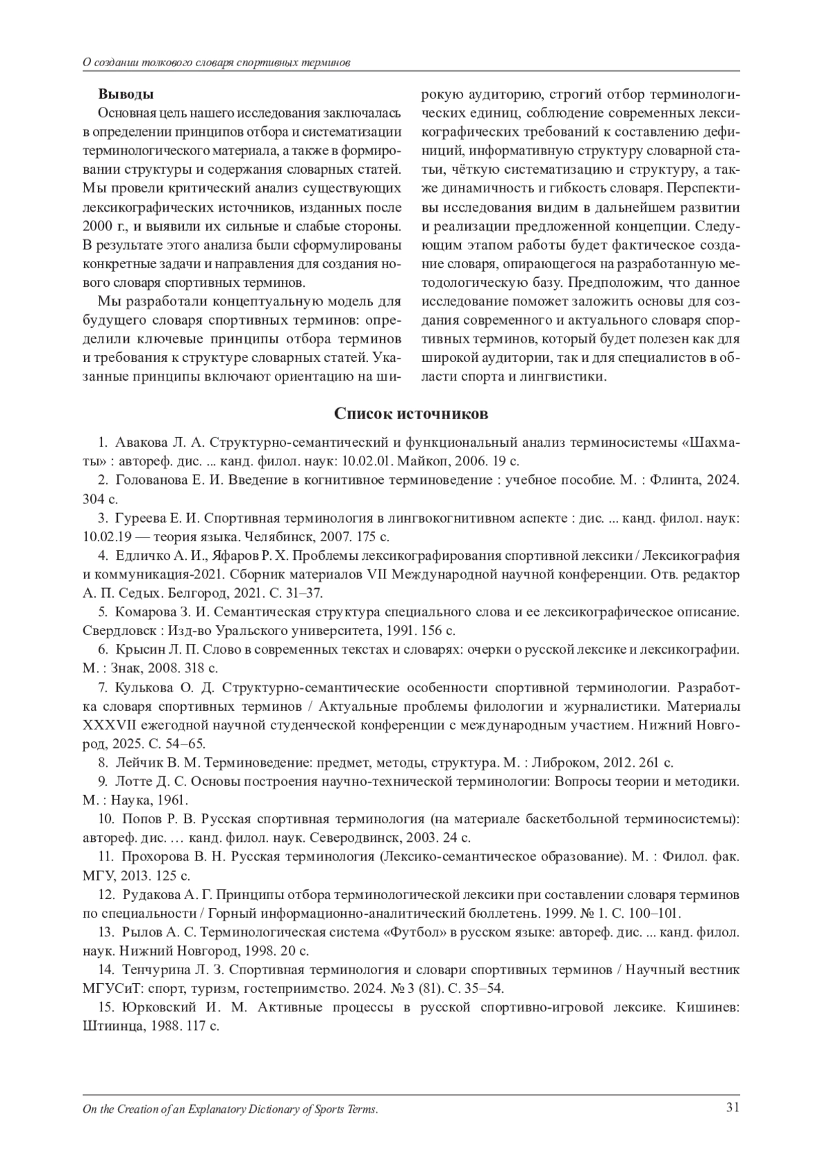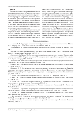 7. Кулькова О. Д. Структурно-семантические особенности спортивной терминологии. Разработка словаря спортивных терминов / Актуальные проблемы филологии и журналистики. Материалы XXXVII ежегодной научной студенческой конференции с международным участием. Нижний Новгород, 2025. С. 54-65. EDN: YZFOYH