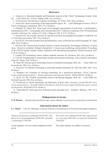 1. Авакова Л. А. Структурно-семантический и функциональный анализ терминосистемы “Шахматы”: автореф. дис..канд. филол. наук: 10.02.01. Майкоп, 2006. 19 с. EDN: NJWKLJ