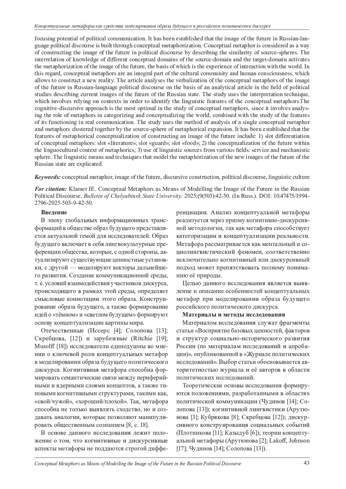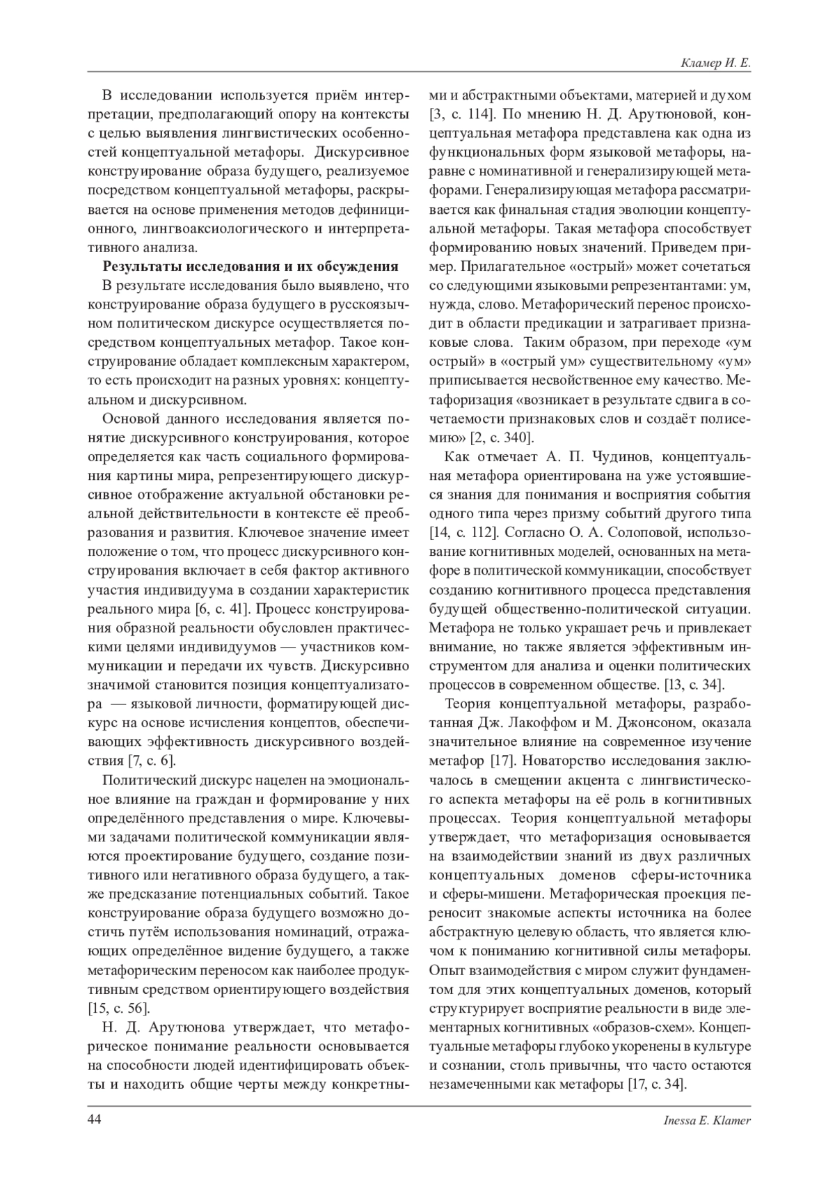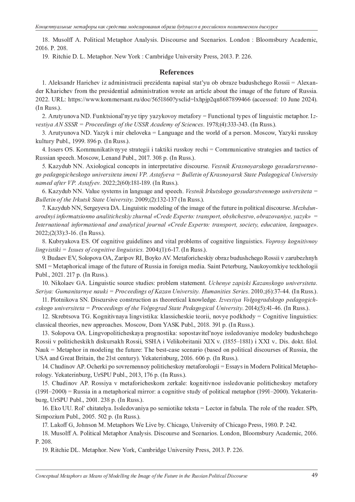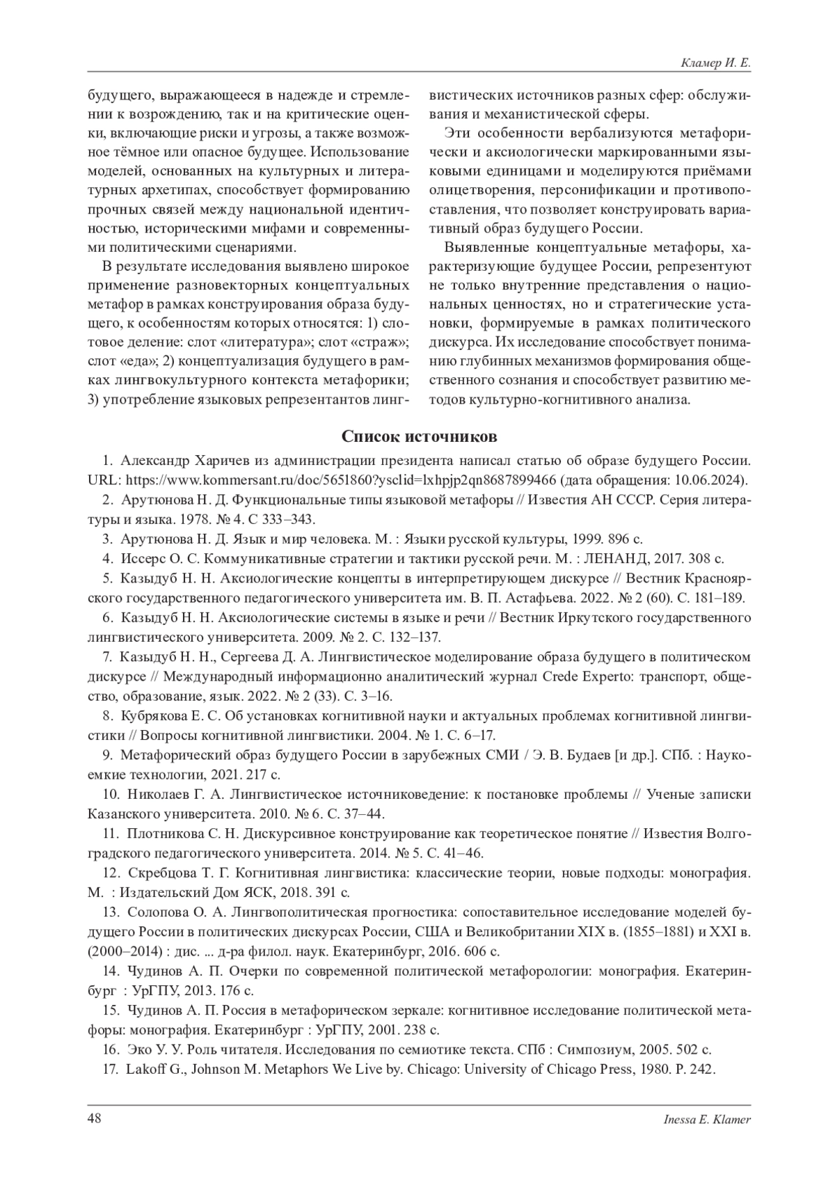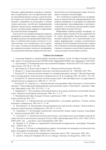 7. Казыдуб Н. Н., Сергеева Д. А. Лингвистическое моделирование образа будущего в политическом дискурсе // Международный информационно аналитический журнал Crede Experto: транспорт, общество, образование, язык. 2022. № 2 (33). С. 3-16.