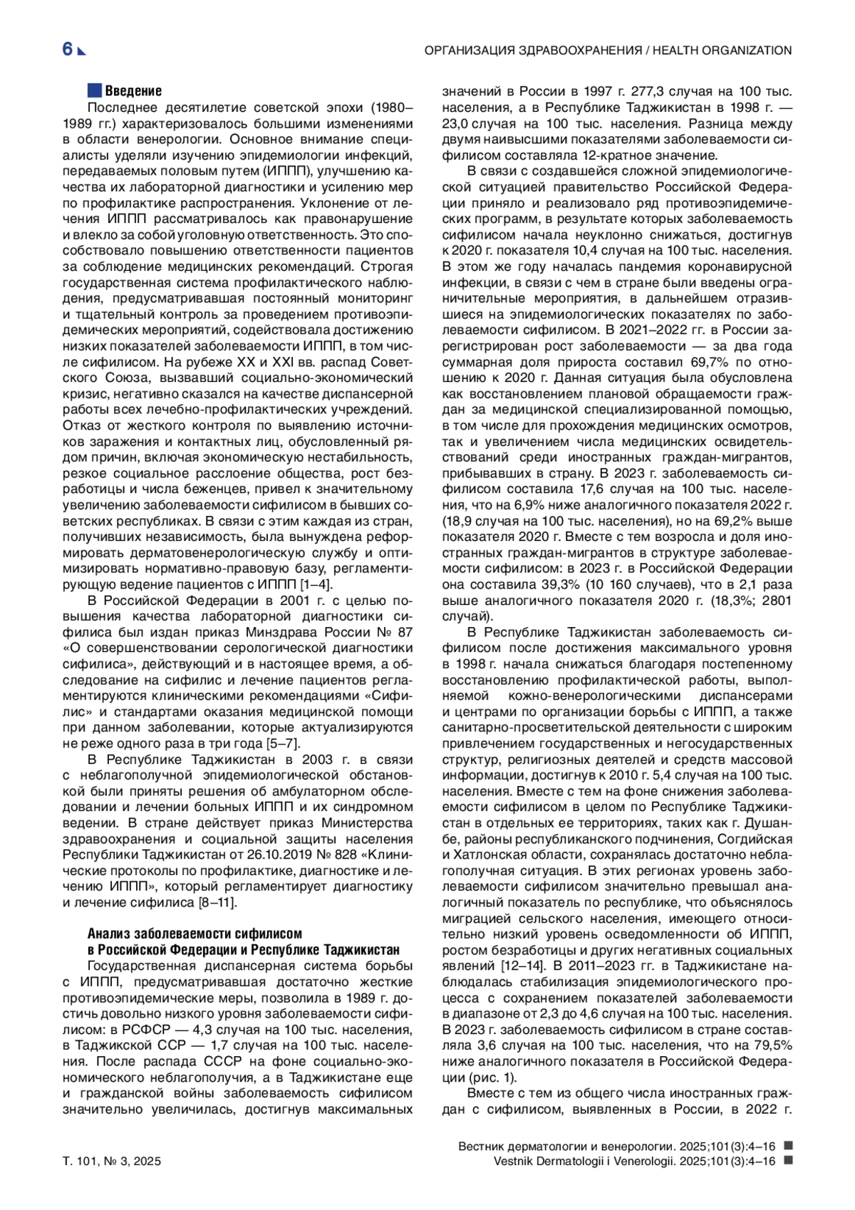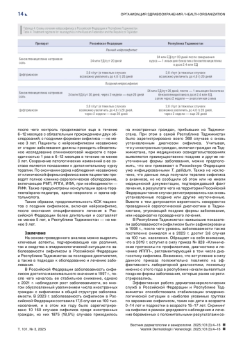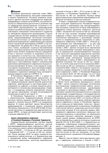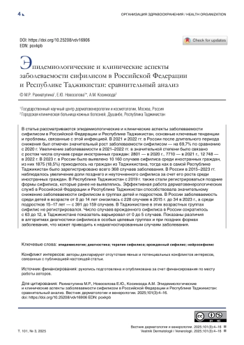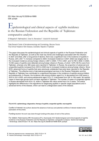 В статье рассматриваются эпидемиологические и клинические аспекты заболеваемости сифилисом в Российской Федерации и Республике Таджикистан, основные ключевые тенденции и проблемы, связанные с этой инфекцией. В 2021 и 2022 гг. в России после длительного периода снижения был отмечен значительный рост заболеваемости сифилисом — на 69,7% по сравнению с 2020 г. Увеличение заболеваемости в 2021–2022 гг. в значительной степени было связано с ростом числа случаев среди иностранных граждан: 2801 — в 2020 г., 7710 — в 2021 г., 12 748 — в 2022 г. В 2023 г. в России было выявлено 10 160 случаев сифилиса среди иностранных граждан, из них 1875 (18,5%) приходилось на граждан из Таджикистана, тогда как в самой Республике Таджикистан было зарегистрировано всего 368 случаев заболевания. В России в 2015–2023 гг. наблюдалось увеличение доли позднего и неуточненного сифилиса за счет его роста среди иностранных граждан. В Республике Таджикистан с 2019 г. также стали регистрироваться поздние формы сифилиса, которые ранее не выявлялись. Эффективная работа дерматовенерологических служб в Российской Федерации и Республике Таджикистан способствовала значительному снижению заболеваемости сифилисом в группах детей и подростков. В России заболеваемость среди детей в возрасте от 0 до 14 лет снизилась с 228 случаев в 2015 г. до 34 в 2023 г., а среди подростков 15–17 лет — с 391 до 159 случаев. В Таджикистане в этих возрастных группах сифилис не регистрировался. Число случаев врожденного сифилиса в России сократилось с 63 до 12, в Таджикистане показатель варьировал от 0 до 5 случаев. Показаны различия в алгоритмах диагностики сифилиса в особых целевых группах и при поздних формах заболевания, что может приводить к недиагностированным случаям заболевания.