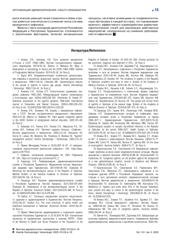 4. Белова Л.В., Баткаева Н.В. Борьба с врожденным сифилисом в СССР. Вестник последипломного медицинского образования. 2020;1:61-68.