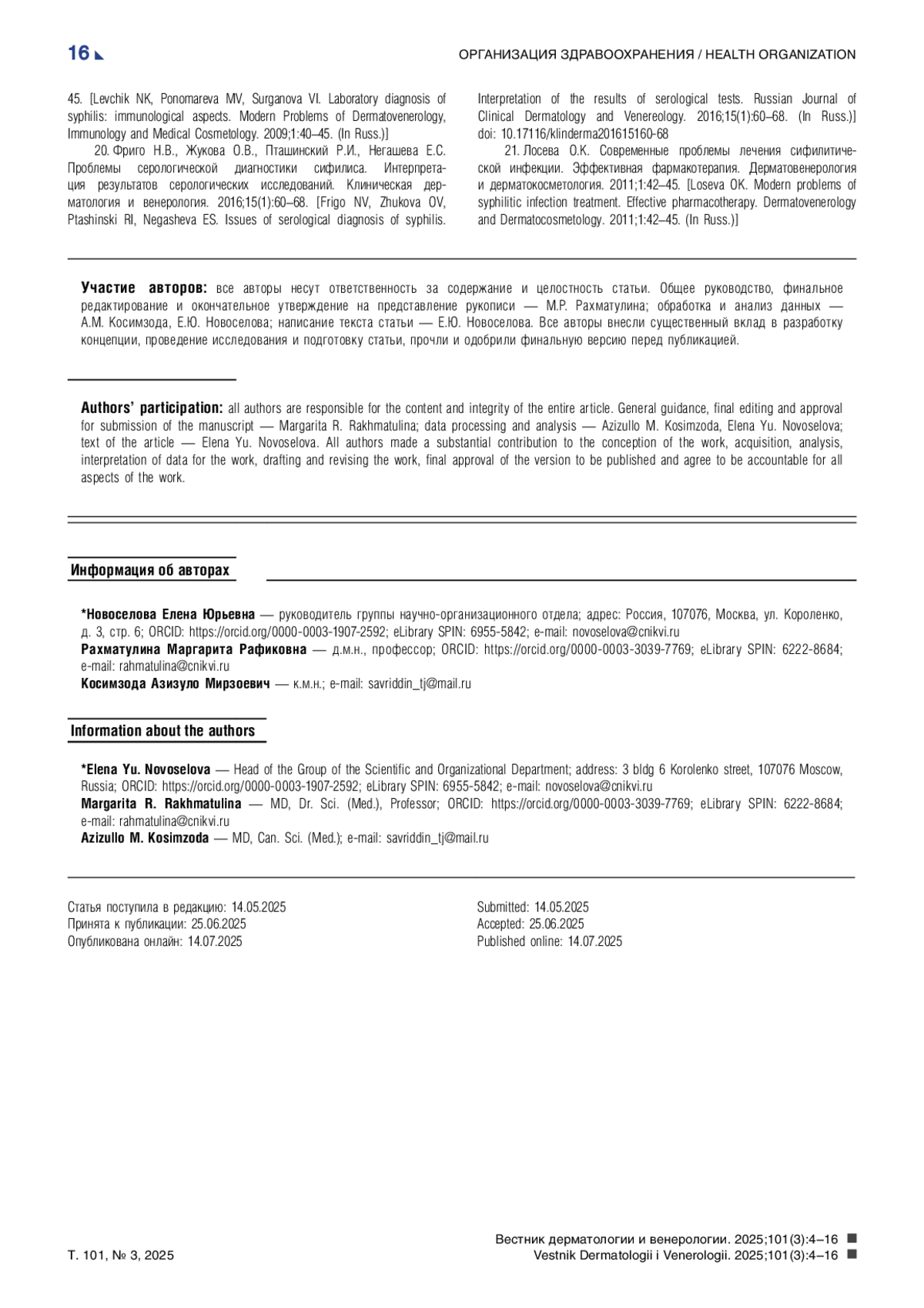 17. Красносельских Т.В., Соколовский Е.В., Рахматулина М.Р., Новоселова Е.Ю., Мелехина Л.Е. Заболеваемость сифилисом и некоторыми другими ИППП в Российской Федерации: прошлое, настоящее и пути достижения контроля эпидемиологической ситуации в будущем. Вестник дерматологии и венерологии. 2023;99(4):41-59. DOI: 10.25208/vdv13726