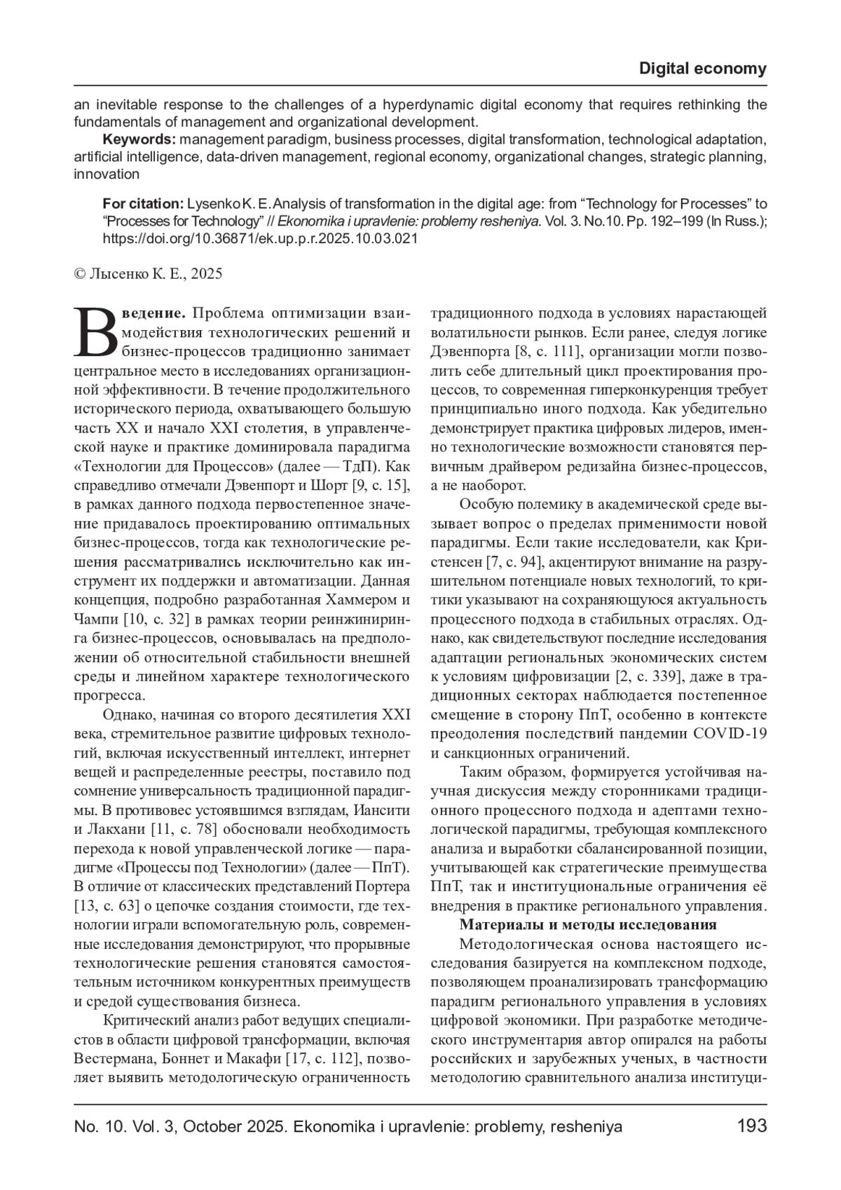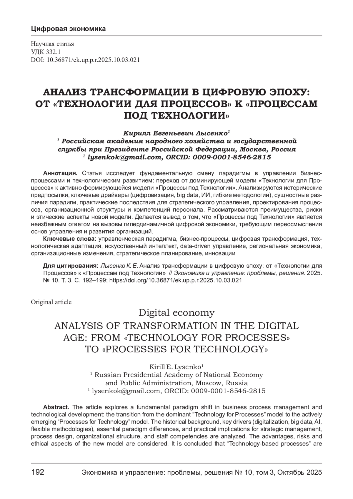 Статья исследует фундаментальную смену парадигмы в управлении бизнес-процессами и технологическим развитием: переход от доминирующей модели «Технологии для Процессов» к активно формирующейся модели «Процессы под Технологии». Анализируются исторические предпосылки, ключевые драйверы (цифровизация, big data, ИИ, гибкие методологии), сущностные различия парадигм, практические последствия для стратегического управления, проектирования процессов, организационной структуры и компетенций персонала. Рассматриваются преимущества, риски и этические аспекты новой модели. Делается вывод о том, что «Процессы под Технологии» является неизбежным ответом на вызовы гипердинамичной цифровой экономики, требующим переосмысления основ управления и развития организаций.